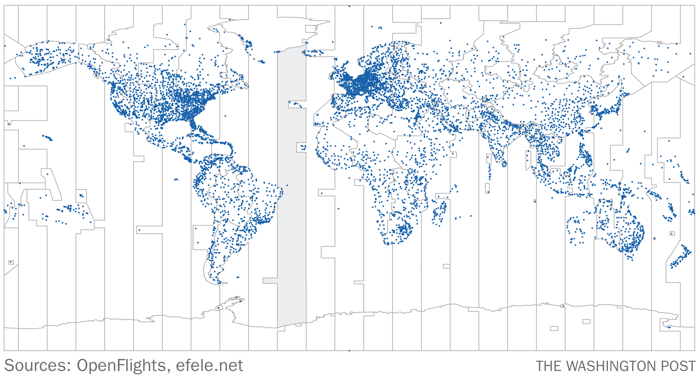 How to celebrate the new year in every time zone This is one of those questions that might occur to someone at some random point in time and which I, unlike people whose brains remain happily non-addled, decided to try to answer. Like, say, how many kids Santa needs to deliver presents to. There's an easy way to do it, of course. Fly to the South Pole and simply walk around it in a circle over the course of the day. Time zones, like lines of longitude, get narrower near the poles, so it's far easier to arrive in place for 24 consecutive midnights there than anywhere else. (Save the North Pole, of course, but since you're reading this in the distant future, I want to ensure there's actually something to stand on should you decided to put this plan into motion.) For a variety of reasons, though, this doesn't seem like it would be much fun. So, when I looked at this question in 2014, I set one ground rule: "celebrate" means "being able to stand still and have a glass of champagne," so no flying to the International Space Station and simply whipping around the Earth a dozen times. Beyond that, anything was game. Obviously, you're going to need an airplane, in order to move quickly from point to point. And once you have an airplane, you need an airport. Here, an interesting-though-predictable correlation emerges: there are more airports in places where people live, which tend to be places further from the poles, which means they tend to be further apart. There's a website, OpenFlights, that provides a crowd-sourced map of the world's airports. They're seen below, juxtaposed with the world's time zones. The problem arises in areas like the one indicated with gray shading. That time zone, two hours west of Greenwich Mean, has only a handful of airports, many south of the equator. So if you're flying from east to west, you need to either incorporate a gradual southern progression — adding more miles and, therefore, time to your flight — or you need some way of landing a plane in the middle of the ocean. My original article included details about the best possible strategy for celebrating the new year hour after hour around the globe, but I'll cut to the chase. Your best bet on aircraft, a former Air Force pilot suggested, was an F-22 Raptor, allowing both for mid-air refueling (which eliminates extended periods on the ground) and both takes off and lands quickly. Since we're assuming we have access to military aircraft and resources, we can then drop an aircraft carrier in that mid-Atlantic dead zone. Now we have a plan: we can get up to 12 consecutive midnight celebrations, starting at an airport in Kadugli, Sudan, progressing across the ocean and ending at Pappy Boyington Field in Coeur d'Alene, Idaho. (The first person to email with the error in the map above (beyond the lack of a label on the airport in the Azores) will get a shout-out in next week's email.) This is not particularly practical, I will admit. There are places where you could cover three time zones with a short car ride, which could be fun. Or, if you insist on confining yourself to planes you might actually be able to access, you could hop across the four zones in the continental U.S., landing in northern airports likely to be blanketed by snow. But the world is simply too big and our airplanes too slow for a full 24-hour circuit to work. Or, at least, it was in 2021. Who knows what the world is like in your time! |