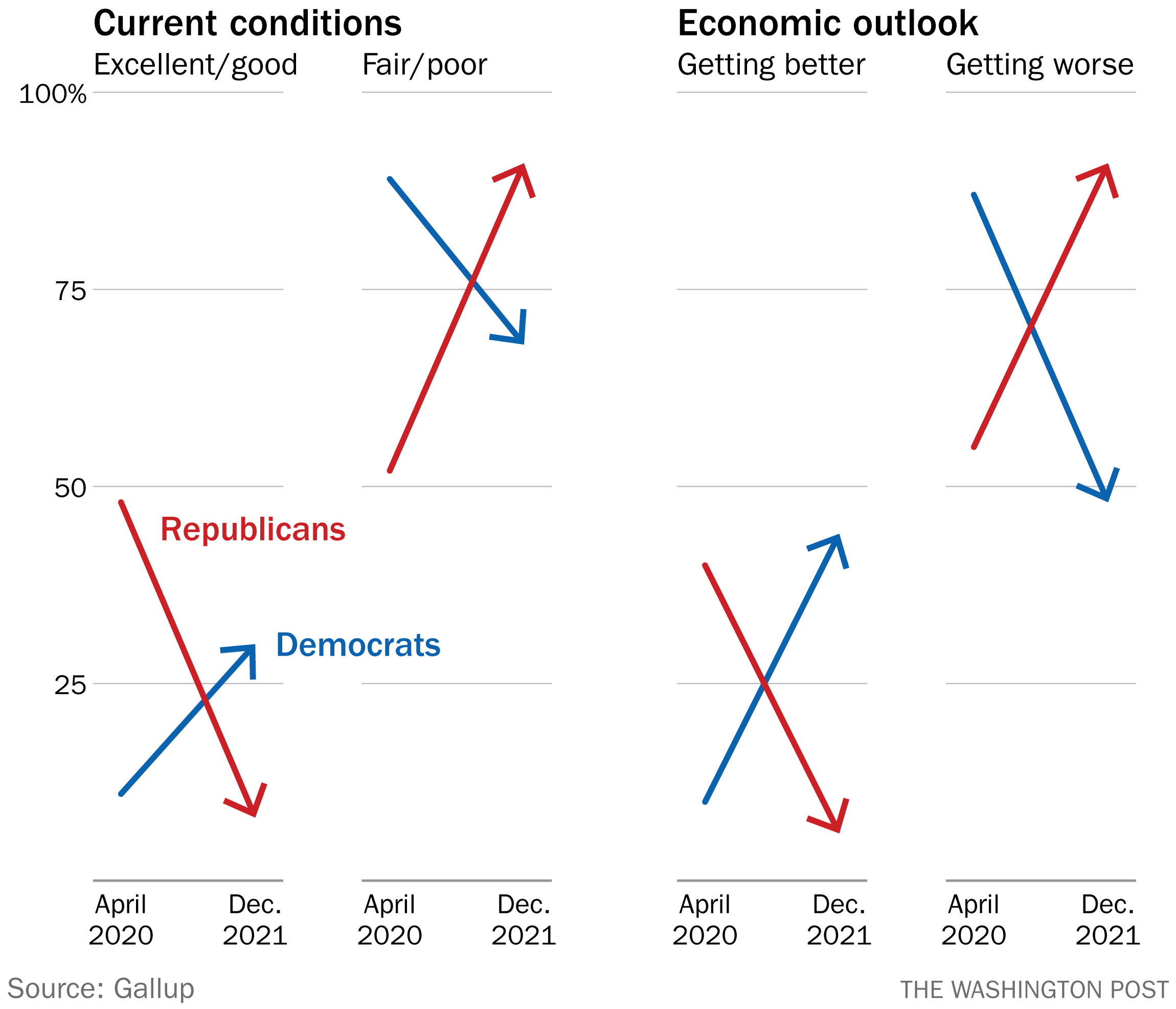 Visualize this! I will admit that the past two newsletters have been somewhat chart-adjacent, focused mostly on maps showing imaginary global travel patterns. It's the holidays; I beg your forgiveness. But last week, as now, I would like to introduce a new, recurring section to the newsletter that is chart-specific. Presenting the inaugural "Visualize this!," a section where I look at an article that could have been improved with the addition of a chart. I came up with the name for this section off the cuff when we were first discussing this newsletter and I recognize that it's very dumb. But I have decided to lean into it, hanging the title around my neck like a stupidly named albatross. Barry the albatross. So. On Wednesday, Post opinion columnist Dana Milbank wrote about the dichotomy between economic indicators and public perceptions of the health of the economy. By most measures, the economy is doing well, but many Americans don't feel as though that's the case. In his column, Milbank pointed to an article I wrote last week, showing how views of the economy shift by party depending on who's running things. He very graciously credited my writing, but it's still probably the case that the point about how Republican views of current economic conditions have flipped since the start of the pandemic is better illustrated visually — and when put in context with the flip among Democrats. | This chart is fairly straightforward, showing the change by party in the percentages saying that the economy is doing well (excellent or good) or not well (fair or poor) in both April 2020 and recently, using Gallup polling. A lot has changed over the past 20 months, including the occupant of the White House. And, in parallel, views of the economy by party have also changed. Some of this is a function of the changes to the economy. Some, clearly, is a function of partisanship. I was going to conclude here with a joke about how in the future, when you're reading this, such partisanship will have evaporated. But even when making jokes, some things are simply too unlikely to consider. |