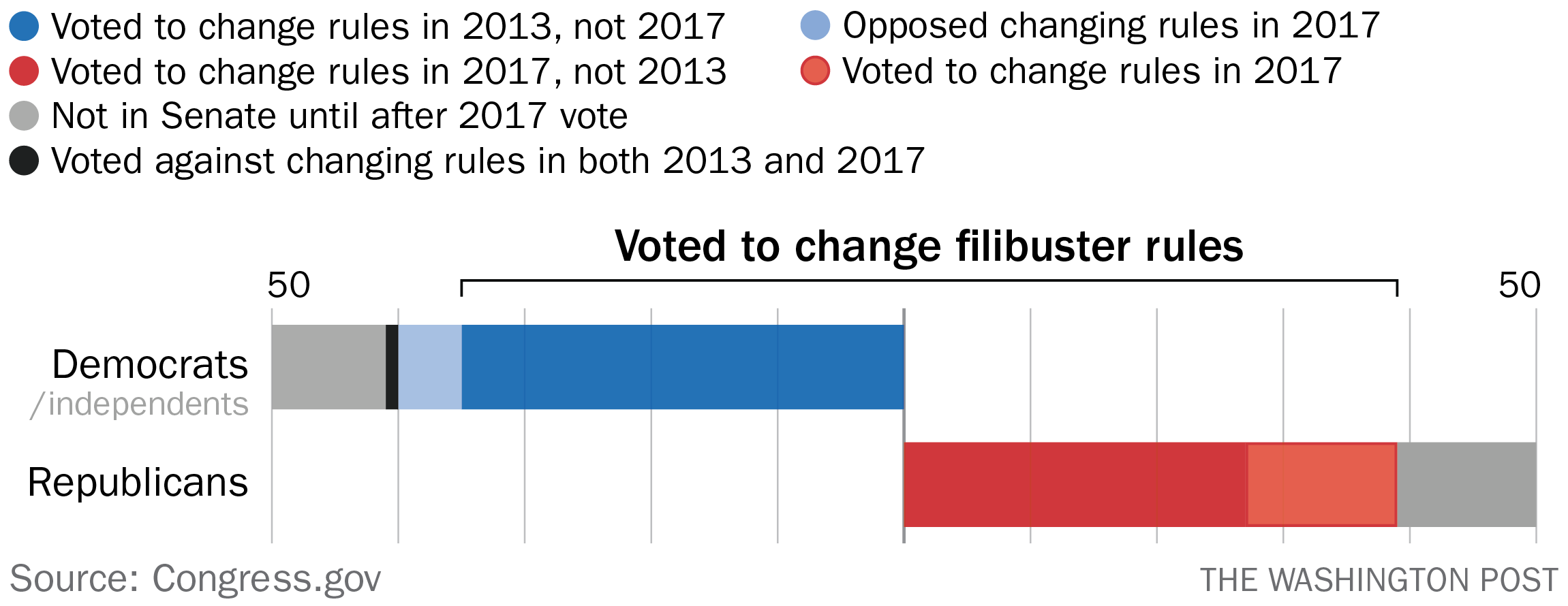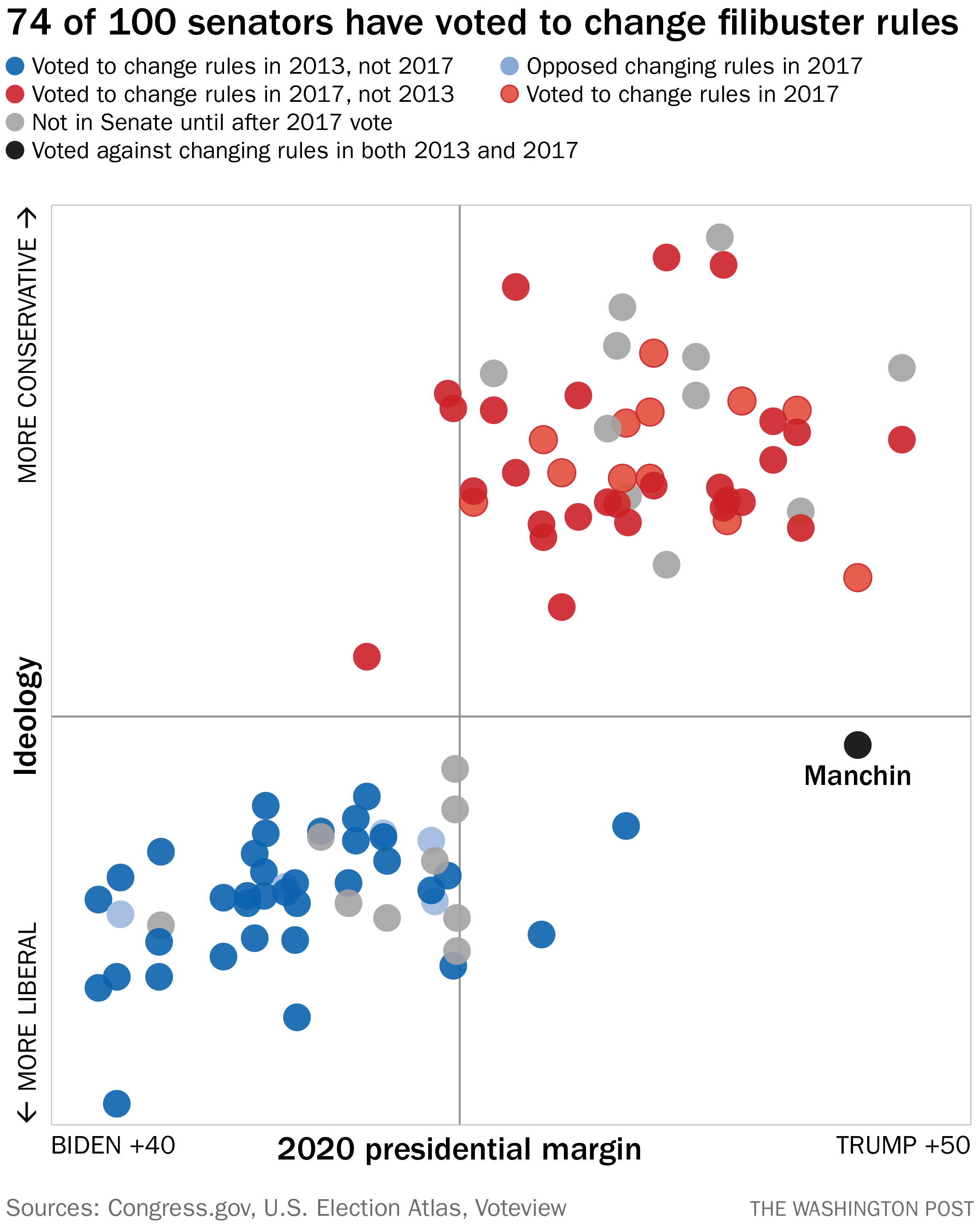 | Did a member of Congress forward this to you? Sign up here. The filibuster is a funny thing. It is often presented as this innovative device inextricably woven into the fabric of the U.S. Senate to uphold the ideals of the Founding Fathers. It is, in fact, an emergent tactic that has in the past been worked around in scores of contexts. In her book "Exceptions to the Rule," Molly Reynolds writes that "[s]ince 1969, Congress has created at least 161 separate special procedures that prevent a filibuster on specified measures." A useful bit of context for considering debates over its inviolateness. That may not be a word. Whatever. What this means is that a lot of the recent debate over whether to set the filibuster standard aside is occurring among people who, in other contexts, have already agreed to make one of those 161 exceptions. Earlier this month, I looked at two examples that seemed pretty on-the-nose as points of comparison to the Democratic push to pass a federal law that would expand access to voting: 2013 and 2017 decisions to ban the filibuster for consideration of presidential nominees. That is, they voted to override the filibuster to increase their own ability to vote. As it turns out, nearly three-quarters of serving senators voted to change the rules on one of those two occasions. Here's one way I presented that data, overlaying admittedly more data than was necessary. I chose to present this as a scatterplot in large part because I think it's more visually interesting. There are a lot of dynamics that emerge when you display the Senate as a comparison of state presidential vote (left to right) versus ideology (top to bottom, using data from Voteview). You see Sen. Joe Manchin (D-W.Va.) there for example, hanging out by himself in Deepredandmoderateland. That may not be a word either. The point: All of those dark blue dots are currently serving senators who chose to override filibuster rules to allow for a majority vote on Barack Obama's nominees in 2013 but opposed a change when Republicans wanted a majority vote on Donald Trump's Supreme Court nominees in 2017. The dark red dots are senators who held the opposite position (that is, the Republican position) both times. Gray dots mark senators elected after the 2017 vote. That there are so few is a reminder of how infrequent turnover is in the U.S. Senate. You will also notice that Manchin's circle is black. He is the only senator who opposed both changes. (Sen. Kyrsten Sinema (D-Ariz.) was not in the Senate for either vote.) Is this an overcomplicated way to show this data? Sure! I'm not vain. I can handle complaints. So in that same article, I offered another way of looking at the same thing. Same key and same color scheme, but organized in a way to show the large chunk of the Senate that had previously voted to change how the filibuster could be applied. When you have the space and the time to do so, there's no harm in offering different presentations of data. This, of course, is called datamultishowaphilia, a word that is, in fact, a word. |