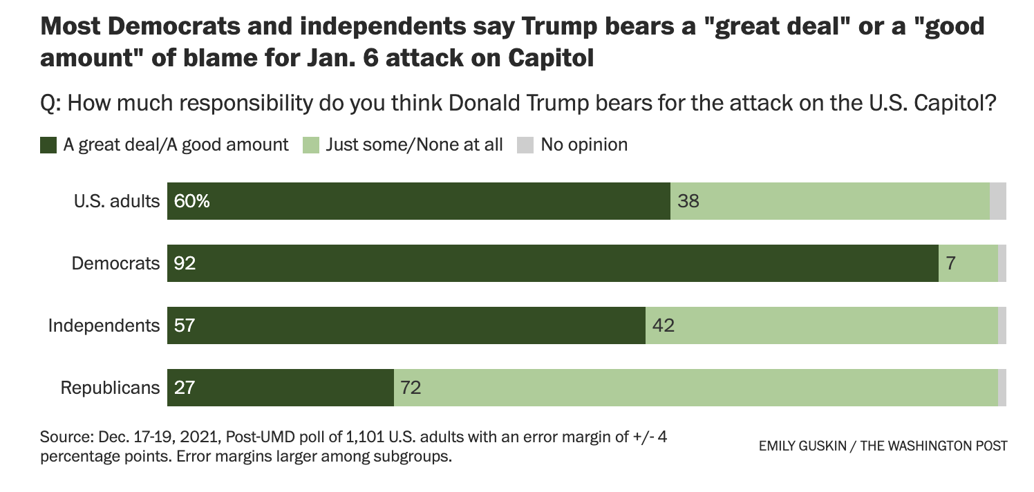 | We're coming up on the anniversary of one of the most significant events in American history: the Jan. 6 attack on the Capitol. Outgoing President Donald Trump urged his supporters to help him overturn his election loss, and many of them stormed Congress as lawmakers there confirmed President Biden's win. The attack led to the deaths of five people. Lawmakers, aides and overwhelmed Capitol police were terrorized, the Capitol was ransacked, and a year later, we're still trying to understand how this happened and what it means for American politics and society. There are two separate investigations into what happened 1. The law enforcement investigation Jacob Chansley received 41 months in prison. (AP Photo/Manuel Balce Ceneta) | Hundreds of people participated in the attack that day. Many of them posted about it on social media. The Justice Department has taken the lead on prosecuting these people in what has become one of the largest federal criminal investigations ever. So far, 725 people have been charged, most of them with smaller crimes like trespassing or resisting arrest. Thirty-one people have received jail sentences, and the Justice Department is still trying to figure out what larger crimes to charge key attackers with: Treason? Obstruction of a congressional proceeding? There isn't an easy legal answer for something like this. Some have expressed contrition in the courtroom. "The hardest part about this is to know that I'm to blame," said Jacob Chansley, the so-called "QAnon Shaman." "To have to look in the mirror and know, you really messed up. Royally." Others, not so much. Some are trying to run for office. 2. The congressional investigation What the House Jan. 6 special committee finds will be the only official federal account of what happened, how much the president instigated it and how to prevent it from happening again. It has quietly interviewed hundreds of witnesses, received tens of thousands of pages of documents, has recommended to the Justice Department that two top Trump allies go to jail for not cooperating, and is trying to interview fellow members of Congress about their potential involvement in the attack and conversations they had that day with the president. "Our families, our districts and our country demand that we get as much of the causal effects of what occurred and come up with some recommendations for the House so that it won't ever happen again," Chairman Bennie G. Thompson (D-Miss.) told The Post. Committee members are racing to finish their work before this time next year, when it's very possible Republicans will take back control of the House and disband the panel. The committee plans to start sharing more publicly what it found. So far, the investigation has revealed a few things, including that Republicans — including Trump's children — reached out to Trump's chief of staff in a panic that day asking him to get the president to call off the rioters. For hours, the president didn't. Key questions the committee wants to answer include: How much did Trump institutionalize this violence? Who was funding these right-wing groups? How involved were Republican members of Congress? How Americans feel about what happened They're torn along partisan lines about how to remember Jan. 6. A new Washington Post-University of Maryland poll finds that just 26 percent of Republicans think the protesters who entered the Capitol were mostly violent; 72 percent of Republicans say Trump doesn't really bear responsibility for what happened; a majority of Republicans (58 percent) believe Biden's election wasn't legitimate; and 40 percent of Republicans and independents say violence against the government is sometimes justified. Most Democrats view what happened with the opposite lens. How Republican leaders are talking about this Largely by glossing over the attack and its aftermath, or outright lying about what happened. The status quo talking point is quickly becoming what Trump regularly says in statements: That the "real insurrection happened on Nov. 3," not Jan. 6. Huge media personalities on the right like Tucker Carlson on Fox News are openly spreading lies about who took part in it, trying to deny the very images the world saw unfold in real time. In Congress, rare is the Republican lawmaker who says the committee's work is valuable. (Senate Minority Leader Mitch McConnell recently did, raising eyebrows.) Instead, lawmakers downplay the attack and its importance. Former vice president Mike Pence, whose life was specifically threatened that day, said it was "just one day in January." As PolitiFact puts it, many of the leaders of the Republican Party during the attack are angling for a promotion: "Trump, acquitted in the Senate for a second time, may run again in 2024. [Rep. Kevin] McCarthy [R-Calif.] is angling to take back the speakership. Carlson remains one of the most-watched cable news hosts on TV." How Democrats are talking about this Well, they definitely aren't downplaying the severity of what happened. But they are torn about how much to talk about Jan. 6 going into the 2022 midterm elections, where their slim majorities in Congress are threatened, CNN reports. "I don't think we can ever talk too much about how vital it is that we protect our democracy and our freedoms," said Josh Kaul, the attorney general in Wisconsin. There aren't signs — at least not yet — that what happened a year ago could motivate the Democratic base, like the white supremacy rally in Charlottesville did before the 2018 midterm elections. Democracy activists say this hasn't resonated as a dinner-table conversation in America, like covid and the economy — which still poll as Americans' top issues. Can Democrats bring it to the forefront in 2022? |