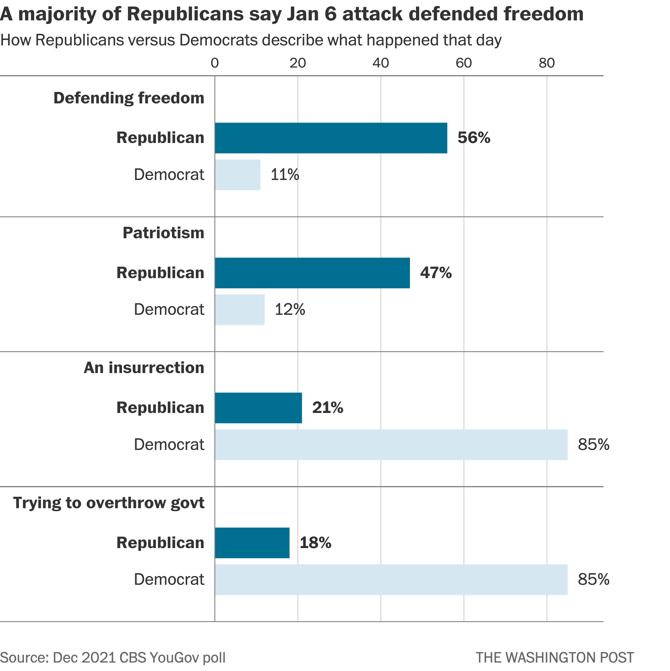 | Democracy in America is under threat. You hear that regularly from politicians — almost all of them Democrats. President Biden said as much today, on the anniversary of the attack on the Capitol by Trump supporters: "We are living at an inflection point in history, both at home and abroad," Biden said in a speech marking the occasion. "We are engaged anew in a struggle between democracy and autocracy, between the aspirations of many, and the greed of a few." But, why, specifically do so many Americans feel the state of democracy is so dire? A few legitimate reasons: 1. Democracy's bedrock — free and fair elections — came under threat in 2020 like never before in modern history. "If you use democracy as a shorthand for: 'We elect our leaders, and the person who gets the most votes wins,' what happened in 2020 and some of what is happening since threatened that principle," said Trey Grayson, a Republican who is former Kentucky secretary of state. Politicians (Democrats included) raised questions about election results in 2000, 2004 and 2016. But not until 2020 did a sitting president try to overturn results. 2. The Big Lie is spreading. Former president Donald Trump ultimately failed to stay in power, but he succeeded in warping the beliefs of a majority of a major political party. Today, somewhere between 60-70 percent of Republicans believe his false claim that the election was stolen. Attendees at the Trump rally and Capitol riot that day are running for governor, Congress, local school boards. Trump and his allies are propping up candidates who deny the results of the last election to run the next election. Poll workers report death threats for certifying the results. Anyone who wants to win a Republican primary has to deny the results of the election. "It's all coordinated — and it's laying the groundwork to overturn the will of American voters," said Joanna Lydgate, president of the nonpartisan States United Democracy Center. Former New Jersey governor Christine Todd Whitman, a Republican actively involved in pro-democracy efforts, told me this: "In the year since the January 6 insurrection, Trump and his allies have not stopped peddling the lies about the 2020 election — they've just found new ways to keep these dangerous lies alive." Is there reason for optimism? President Biden speaks from the US Capitol on Jan. 6 about the threat to democracy. (Jabin Botsford/The Washington Post) | Optimistic Republicans and Democrats I talk to will point out that despite all this stress in 2020, the system worked. A handful of Republicans in the right place at the right time stood up to Trump and wouldn't change the popular vote of the people they represent. They include: Arizona's governor, Georgia's secretary of state and Michigan lawmakers who met with the president. Even former vice president Mike Pence is on this list. He refused to flip the results even after protesters threatened his life on Jan. 6. Trump-appointed judges slapped down false voter fraud claims in court. A year after the election, audit after audit — even Republican-led ones — have come up empty, too. What we don't yet know, especially with the transformation of the Republican Party into one that denies Trump's loss: Are there enough Republicans who believe in democracy and will fight to protect it? Today, a year after the attack, more Republicans describe what happened on Jan. 6 as defending freedom or patriotism rather than as an insurrection, according to a new CBS/YouGov poll. So what did Republican leaders do today? House Minority Leader Kevin McCarthy (R-Calif.) has been largely silent about the attack. (Jabin Botsford/The Washington Post) | They made clear that they'll support Trump's election lie, at least implicitly, by not calling it out and not addressing some of the frayed ends of democracy that we just talked about. Here's what a few top Republicans said shortly after the attack — compared to what they said a year later. House Minority Leader Kevin McCarthy (Calif.), then: "The president bears responsibility for Wednesday's attack on Congress by mob rioters." McCarthy, today: Nothing. He issued no statement and did not attend memorials for it. Senate Minority Leader Mitch McConnell (Ky.): "There is no question that President Trump is practically and morally responsible for provoking the events of that day." McConnell, today: No mention of Trump. He attacked Democrats instead. "January 6th, 2021 was a dark day for Congress and our country … it has been stunning to see some Washington Democrats try to exploit this anniversary to advance partisan policy goals that long predated this event." Sen. Lindsey Graham (S.C.), then: "All I can say is count me out. Enough is enough." Graham, today: He attacked Democrats, too. "What brazen politicization of January 6 by President Biden." "No, I'm not a moderate" If you read one thing (besides this newsletter) today on Jan. 6, let it be this Post story illustrating how the Republican Party is now a party of election deniers. In it, a Republican Arizona state senator told my colleagues he isn't going to run for office again because he's not willing to say the election was stolen. He feels like he doesn't have a home in the Republican Party anymore as a result. "If you ask any of my Democratic colleagues, they'll tell you how conservative I am," Paul Boyer said. "And the fact that on one issue I didn't agree with the party makes my belief on limited government, on school choice, on life, on public safety, all out the window — it's like, no, I'm not a moderate." |