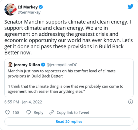 | | Maxine Joselow | | Manchin voices support for the climate provisions in the Build Back Better Act | Sen. Joe Manchin III (D-W.Va.) speaks with reporters outside his Capitol Hill office on Jan. 4. (Jabin Botsford/The Washington Post) | | | Sen. Joe Manchin III (D-W.Va.) yesterday offered some of his strongest comments to date in support of the climate provisions in Democrats' social spending bill, providing a measure of relief for climate advocates, even as the timeline for voting on the bill was delayed yet again. "I think that the climate thing is one that we probably can come to agreement much easier than anything else," Manchin told reporters, including The Washington Post's Seung Min Kim, in his first remarks on the Build Back Better Act in the new year. Manchin, who chairs the Senate Energy and Natural Resources Committee, has previously expressed concerns about several climate provisions in the roughly $1.75 trillion measure, including a fee on methane emissions and a bonus tax credit for union-made electric vehicles. His concerns culminated in a Dec. 19 statement in which he asserted that BBB would "risk the reliability of our electric grid" and would spur the transition to clean energy "faster than technology or the markets allow." Still, the senator added yesterday that he has had "no conversations" with the White House since he released the bombshell statement more than two weeks ago. He also repeated his laundry list of other concerns with passing the legislation now, including rising inflation, geopolitical uncertainty and the still-raging coronavirus pandemic. Jamal Raad, executive director of the environmental group Evergreen Action, told The Climate 202 that Manchin's comments on climate were "certainly encouraging." "I think it underscored what climate advocates have been saying since this unraveled last month, which was the climate provisions are the most fully baked of all of the proposals in Build Back Better, that there's widespread agreement on 95 to 99 percent of the provisions in there," Raad said. | Sinema isn't standing in the way | | Before Manchin's comments, Sen. Brian Schatz (D-Hawaii) said that Sen. Kyrsten Sinema (D-Ariz.), another moderate who has raised concerns about some aspects of BBB, has not complained about the climate language to him. "I can only speak to my experience with Senator Sinema, and although we disagree on a ton, she has been nothing but supportive of the climate provisions here," Schatz said on a virtual call yesterday hosted by Climate Power and the League of Conservation Voters. Asked for comment, Sinema spokeswoman Hannah Hurley pointed to the senator's interview with the Arizona Republic in September. Sinema told the publication that "we know that a changing climate costs Arizonans. And right now, we have the opportunity to pass smart policies to address it." | | Democrats on the call yesterday also cited recent climate disasters as proof of why passing the legislation cannot wait. Sen. John Hickenlooper of Colorado said his constituents were devastated by the record-breaking wildfire there last week, which scientists said was fueled by extreme climate conditions, while Schatz alluded to the rising sea levels that threaten Hawaii. "We're going to get this done, come hell or high water," Schatz said. "Because right now we have both hell and high water." A recent Washington Post analysis found that 1 in 3 Americans lived through a weather disaster last summer, including hurricanes, floods, heat waves and fires. | Durbin acknowledges delay | | Still, Senate Majority Whip Richard J. Durbin (D-Ill.) said yesterday that the Senate would pause work on BBB until Democrats have considered voting rights legislation, pushing a vote until the second half of January at the earliest. | | "We are focused on voting rights, as we should be," Durbin told reporters. "And I think the White House is joining us in that effort, and clearly we'll return to Build Back Better as soon as that is done." Raad of Evergreen Action said he felt "immense frustration" that BBB has been delayed repeatedly "and that it hasn't been moved along at the same speed as the bipartisan infrastructure bill." "That's a real concern," he said, "because as anyone knows, the later you get into an election year, the harder it is to get anything done." | | Sen. Edward J. Markey (D-Mass.): | | | | | | |  | On the Hill | | Retiring congressman criticizes Republicans' stance on climate change | Rep. Peter A. DeFazio (D-Ore.), chairman of the Transportation and Infrastructure Committee, at the Capitol on Sept. 14. (J. Scott Applewhite/AP) | | | Rep. Brenda Lawrence (D-Mich.) announced yesterday that she would retire at the end of her term, making her the 25th House Democrat that will not run for reelection this year or seek another office as the party faces tough odds to hold its majority. The Climate 202 caught up with one of those Democrats, Transportation and Infrastructure Chairman Peter A. DeFazio (D-Ore.), who has been one of Congress's most vocal advocates for slashing carbon emissions from transportation, the nation's largest source of climate pollution. DeFazio, who plans to retire at the end of his term after more than three decades on Capitol Hill, said that Republicans have played down the severity of the climate crisis and repeatedly resisted his efforts to include climate provisions in infrastructure legislation. "There is almost universal [climate] denial on the Republican side of the aisle in the House," he said. "Certainly the public is way more concerned." DeFazio said that Republicans are out of touch with their constituents, who are increasingly contending with wildfires, hurricanes and sea-level rise. Without naming Rep. Garret Graves (R-La.), a member of the committee, he said that "you can't deny that Louisiana is going underwater." DeFazio acknowledged that many Republicans have voiced support for "resilience," a term that describes hardening infrastructure t