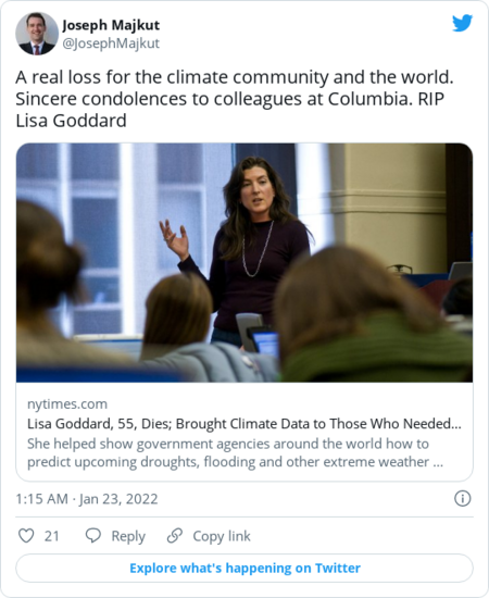 | | "Governor Hochul has committed to achieve two million electrified and efficient homes by 2030, while prohibiting new buildings from emitting greenhouse gas emissions onsite by 2027 through improved building codes," Hazel Crampton-Hays, a spokeswoman for Hochul, said in an email to The Climate 202. "These commitments represent the most ambitious building decarbonization strategy in the nation." Rachel Rivera, a member of New York Communities for Change, a nonprofit organization dedicated to social and climate justice, applauded Hochul while calling for a faster timeline. "It's a good news, bad news scenario: Governor Hochul put a gas ban in her proposed budget, which is vital to create jobs, cut air pollution and fight climate change. But her proposal would be implemented too slowly, leaving too many years before new buildings went fossil-free," Rivera said in a statement. "There's no time to waste with the climate crisis: delay equals death." | California could slash rooftop solar incentives | | The California Public Utilities Commission last month proposed major changes to net metering, the mechanism that credits owners of rooftop solar panels for the excess electricity they sell back to the grid. | | |  | On the Hill | | Wind, solar and storage companies urge passage of Build Back Better Act | Wind turbines near Snyder, Tex., on Dec. 27. (Eli Hartman/Odessa American/AP) | | | Members of the American Clean Power Association, a trade group that represents wind, solar, transmission and storage companies, today sent a letter to congressional leadership calling for the swift passage of the Build Back Better Act. The letter asserts that each month of delay on Build Back Better means an estimated $2 billion in lost economic activity. It adds that the legislation will help the United States reach 750 gigawatts of wind, solar and battery storage by 2030, which would cut power-sector emissions by nearly 70 percent below 2005 levels. The legislation includes a $320 billion package of tax credits for clean energy and clean vehicles that Senate Finance Chairman Ron Wyden (D-Ore.) has called the "linchpin" of the bill's $555 billion in overall climate spending. After President Biden said last week that Democrats can pass "big chunks" of Build Back Better, several climate hawks in the Senate called for the swift passage of any climate provisions that can meet the 50-vote threshold in the chamber. | | Meanwhile, Sen. Bernie Sanders (I-Vt.) said on NBC's "Meet the Press" yesterday that Biden cannot count on him to support "almost any" climate compromise that Democrats strike with holdout Sen. Joe Manchin III (D-W.Va.). "You're going to have to look at what that so-called compromise is," Sanders said. "If it's strong, if it protects the needs of working people, if it deals with climate, I'm there. But we have to look at the details of any proposal." | | |  | Extreme events | | Wildfire near California's Highway 1 forces evacuations | An inspection crew flies along power lines as the Colorado fire burns near Big Sur, Calif., on Jan. 22. (Peter DaSilva/Reuters) | | | Vice President Harris connected the dots on climate change: | | | | | | |  | Pressure points | | Florida is making an urgent effort to save manatees | A manatee surfaces in Riviera Beach, Fla., on Jan. 19. (Joe Cavaretta/South Florida Sun-Sentinel/AP) | | | Rescue teams are racing to protect Florida's iconic marine mammals, which are starving to death as sea grass beds, their primary food source, are destroyed by pollution and toxic algae blooms fueled by climate change, The Post's Lori Rozsa reports. Last year alone saw the deaths of 1,110 manatees — about 15 percent of the total population in the state. | | |  | International climate | | Biden officials talk to Qatar about supplying Europe with gas | Qatar's emir, Sheikh Tamim bin Hamad Al Thani, attends the Gulf Cooperation Council summit in Kuwait. (Jon Gambrell/AP) | | | Biden administration officials are talking with Qatar about supplying liquefied natural gas to Europe if Russian President Vladimir Putin invades Ukraine, potentially triggering shortages, Bloomberg's Jennifer Jacobs and Annemarie Hordern report. Biden plans to ask Qatar's emir, Sheikh Tamim bin Hamad Al Thani, to meet at the White House this month. Some European countries have expressed concern that sanctioning Russia over a Ukraine invasion could prompt Putin to curb gas supplies, preventing people from heating their homes in the middle of winter. | | |  | In memoriam | | Lisa Goddard remembered as 'authoritative' voice on climate science | Lisa Goddard in her office at Columbia University's International Research Institute for Climate and Society. (Francesco Fiondella) | | | Lisa Goddard, a climate scientist at Columbia University who used cutting-edge computer models to bring people information about upcoming floods, heat waves and other climate disasters, died Jan. 13 at age 55. The cause was breast cancer, the New York Times's Clay Risen reports. Goddard, who ran Columbia's International Research Institute for Climate and Society from 2012 to 2020, worked to predict climate-fueled extreme weather events with weeks or months of lead time. That marked a shift from the way climate prediction models were used in the early 2000s to predict disasters in 50 to 100 years, according to John Furlow, who succeeded Goddard as director of the institute. "Lisa was a very loud and authoritative voice saying, 'Look, people aren't making decisions now for things that will be relevant at the end of the century,'" Furlow told the Times. | | Joseph Majkut, director of energy security and climate change at the Center for Strategic and International Studies: | | | | | | |  | Viral | | |