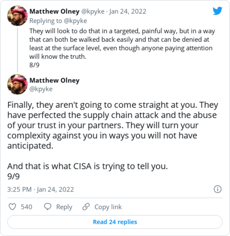 | | Here's Matthew Olney, director of threat intelligence for Cisco's Talos cyber intelligence wing, which researched the recent Ukraine attacks. | | Tensions have ratcheted up further by what seemed to be a cyberattack targeting rail systems in Belarus. | | The Belarusian hacktivist group Cyber Partisans took credit for the attack, which it said was aimed at impeding Russian troops and freight from using train services inside the Moscow-allied nation. The group pledged in a tweet to call off its attack if government leaders prevent Russian troops from entering Belarusian territory and release 50 political prisoners. | | A troubling precedent: The Cyber Partisans hack appears to have inadvertently disrupted ticket sales, the Associated Press's Frank Bajak reports. The group told Bajak it didn't intend to disrupt regular passenger service and was working to fix the issue. While seemingly minor, the snafu demonstrates how errors in cyber operations can lead to grave and unintended consequences — something that could be particularly damaging during a hot military conflict when adversaries are unlikely to take each other's words that an accident is truly an accident. | | |  | The keys | | The SEC is considering expanding its cybersecurity rules for companies | SEC Chairman Gary Gensler previewed the potential changes Monday. (J. Scott Applewhite/AP) | | | The Securities and Exchange Commission is considering requiring a broader swath of financial firms to test for cyber weaknesses, back up data and have plans for potential cyberattacks, the Wall Street Journal's Paul Kiernan reports. The rules currently apply to stock exchanges and other large intermediaries between securities buyers and sellers. Other possible changes include: | - A shift in the timing and substance of notifications that brokers and investment advisers have to send when they're hacked