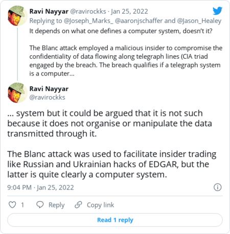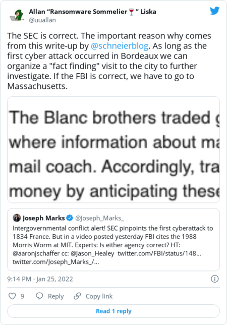 | | Polish state security spokesman Stanislaw Zaryn told the AP that the country conducts surveillance in limited cases and is bound by Polish law. The leader of Poland's ruling party has admitted that the country purchased Pegasus, but denied that it was used to target opposition figures in a high-stakes election campaign. NSO "has been the subject of a growing number of news reports about financial, corporate and legal struggles," Craig writes. "The departure of the company's chairman, Asher Levy, became public on Tuesday. A newly appointed chief executive announced his resignation in November after just two weeks on the job." NSO told news outlets that Levy's departure had been previously planned, and that reports of financial and other troubles are unfounded. | Federal prosecutors are reviewing fake election documents that said Trump won states he actually lost | Trump attorney Rudolph W. Giuliani was at the center of the effort. (Sarah Silbiger for The Washington Post) | | | Deputy Attorney General Lisa Monaco acknowledged the Justice Department is probing the phony certificates after weeks of requests by lawmakers and state officials for a federal investigation, CNN's Evan Perez and Tierney Sneed report. The move comes days after my colleagues reported that the effort by Republican electors in Arizona, Georgia, Michigan, Nevada and Wisconsin was assisted by Trump campaign officials and attorney Rudolph W. Giuliani. "A Justice Department spokesman declined to comment Tuesday on when prosecutors began looking into the matter, whom they were targeting or even if they were conducting a full-fledged investigation, rather than just assessing referrals from state attorneys general," my colleague Matt Zapotosky writes. The House committee investigating the Jan. 6 insurrection is also focusing on how the rival slates were put together, people familiar with the panel's work told my colleagues. | A Michigan woman found out she won $3 million in the lottery after checking her spam folder | Spam about fake lottery wins is extremely common. (Jenny Kane/AP) | | | The unusual incident is giving security pros heartburn. Emails in your spam folder that promise big paydays are almost certain to be hoaxes or con jobs aimed at stealing your information or spreading malware, email security experts say. Laura Spears's $3 million payday "seems to be a classic example of the exception that proves the rule — in this case, don't believe emails that sound too good to be true," Venable managing director Jeremy A. Grant told Annabelle Timsit. Spam emails about lottery wins are especially prevalent. "Lottery fraud is common in the United States: Of the more than 600,000 complaints of fraud the Federal Trade Commission received in the third quarter of 2021, scams that used prizes, sweepstakes and lotteries as bait were the third most common, generating a total loss of $56.3 million for the consumers who fell for them," Annabelle writes. | | |  | Government scan | | Bob Kolasky is leaving CISA | | Kolasky, a longtime Department of Homeland Security official, leads CISA's National Risk Management Center. CISA Director Jen Easterly said in a statement that Kolasky "played an integral role in building the agency and continually advancing our mission." Current and former CISA officials were quick to praise Kolasky. More from Easterly: | | Matt Masterson, CISA's top elections official for the 2020 contest: | | | | | | Former CISA director Chris Krebs: | | | | | | |  | Global cyberspace | | | |  | Industry report | | A telecom industry association is launching a new supply chain security standard | | The Telecommunications Industry Association's new standard is designed to verify the security of hardware, services and software across telecommunications network infrastructure. Its release comes as critical industries have been struggling to figure out how to secure supply chains against hacking and questionable software. | | |  | Hill happenings | | | |  | Securing the ballot | | | |  | Cyber insecurity | | | |  | Chat room | | | What was the first cyberattack? The FBI and Securities and Exchange Commission posted videos this week each claiming a different origin. SEC Chairman Gary Gensler pointed to a scheme to get early telegraph information to profit off securities trading in 1834 France. | | Bryan Vorndran, assistant director of the FBI's cyber division pointed to a computer worm developed at the Massachusetts Institute of technology in 1988. | | | | | | Who's right? University of Sydney PhD candidate Ravi Nayyar said it depends: | | But a story that begins in Bordeaux sounds more enjoyable to investigate than one that begins in Boston, Recorded Future's Allan Liska notes: | | |  | Daybook | | - FTC Commissioner Noah Phillips discusses data privacy at an event hosted by the National Cybersecurity Alliance and LinkedIn today.