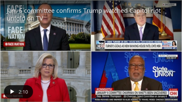 | Jan 6. panel expected to hold public hearings and issue reports in the coming months | | The investigation continues: The House committee investigating the Jan. 6 attack on the Capitol will continue their work into the new year by reviewing videos Trump recorded while the riot was taking place and information from the Willard InterContinental hotel in Washington, D.C. | - Rep. Bennie Thompson (D-Miss.), the chairman of the panel, told Chuck Todd on NBC's "Meet the Press" that Trump recorded "several videos" before posting a one-minute clip urging his supporters to go home. Thompson told Todd that the committee asked the National Archives for the videos.