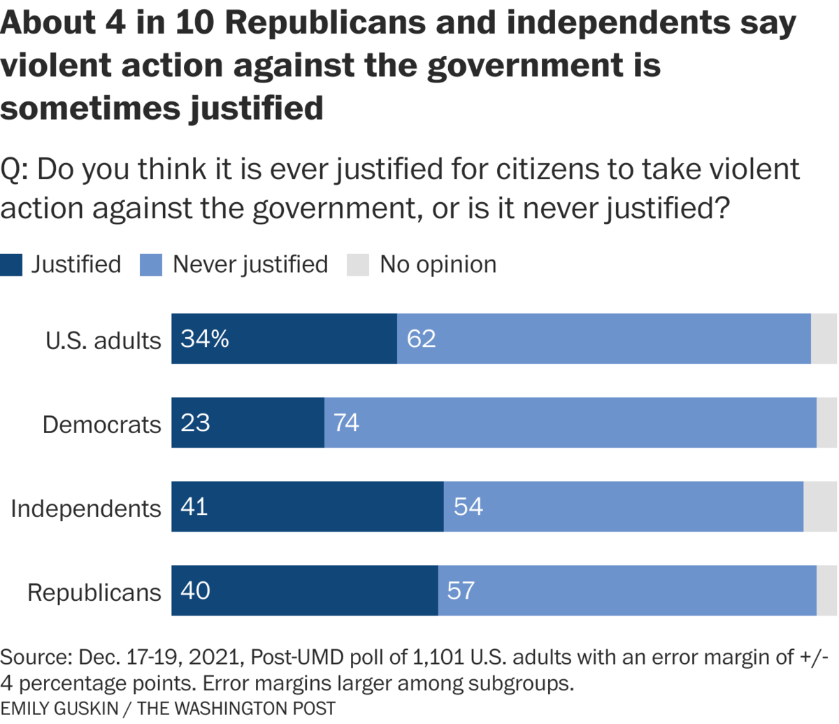 - About that dominion: "A Washington Post-University of Maryland poll finds that about 1 in 3 Americans say they believe violence against the government can at times be justified," our colleagues Meryl Kornfield and Mariana Alfaro report. "The findings represent the largest share to feel that way since the question has been asked in various polls in more than two decades. They offer a window into the country's psyche at a tumultuous period in American history."