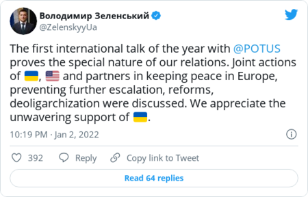 | | These developments come as the committee prepares to hold public hearings and eventually release its final report. However, the panel is "confronting a series of difficult questions, including how forcefully to flex its subpoena power and whether the Supreme Court will stymie a major element of its inquiry" – access to White House records related to the attack, the New York Times's Luke Broadwater and Emily Cochrane report. | | |  | At the White House | | Biden tells Zelensky U.S., allies will 'respond decisively' if Russia invades Ukraine | | From Ukrainian President Volodymyr Zelensky: | | | | | | New year, same old crisis: "Biden conferred on Sunday with Ukraine's leader over the Russian troop buildup near its border, promising that the U.S. and allies will act 'decisively' if Russia further invades the Eastern European nation," AP News's Aamer Madhani reports. | - "Biden and President Volodymyr Zelenskyy's call came as the U.S. and Western allies prepared for a series of diplomatic meetings to try to de-escalate a crisis that Moscow said could rupture ties with Washington."
