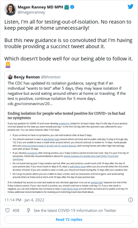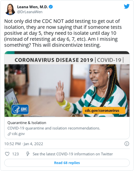 | Following confusion, the CDC doubles down on its isolation and quarantine guidelines | | The Centers for Disease Control and Prevention clarified the rationale behind its decision to shorten isolation and quarantine recommendations after coming under fire from public health experts who thought a negative test should be required. The health agency reaffirmed that people who were infected but asymptomatic can leave isolation and return to work or school without testing after five days. But the agency clarified that anyone who has access to a test — and wants to take it — can do so. If they receive a positive test result, they should continue to isolate for five additional days, The Post's Meryl Kornfield reports. David Paltiel, a health policy professor at Yale School of Public Health, told The Health 202 that even if testing after isolation is ideal, requiring testing would be unworkable given the national shortage in tests. | - "[T]hey can't very well make that recommendation so long as antigen tests remain in such short supply. I mean, how elitist would it look if the only people who could follow federal guidance were well-heeled Ivy League colleges and individuals who have sufficient disposable income to buy a stockpile of these tests," Paltiel said.