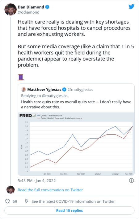 - Health workers have left the profession during the pandemic, but claims that 1 in 5 health workers quit the field appear to overstate the problem, The Post's Dan Diamond wrote on Twitter.