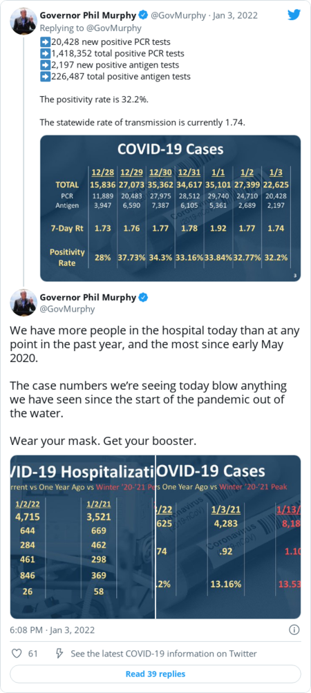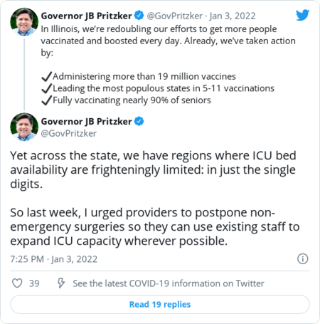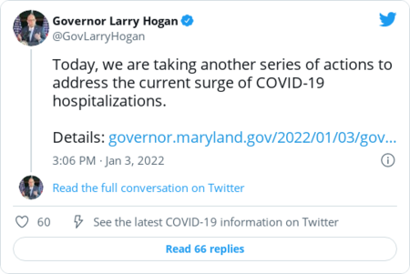 | | Coronavirus-related hospitalizations rose 27 percent in the last week, according to data tracked by The Post, though they often lag behind case counts. Early U.S. data and several international studies point to omicron being less severe — particularly for those vaccinated and boosted — but the sheer volume of new infections means covid-19 patients may still overwhelm hospitals. | | Some governors are already sounding the alarm, as they ready for what's likely to be a brutal next few weeks as the country enters Year 3 of its pandemic response. | | Illinois Gov. J.B. Pritzker (D): | | | | | | Maryland Gov. Larry Hogan (R): | | | | | | New Jersey Gov. Phil Murphy (D): | | | | | | |  | Coronavirus | | The FDA authorized Pfizer-BioNTech boosters for 12-to-15-year-olds | | The FDA decision comes as many schools are reopening after the holidays amid a surge in cases driven by the omicron variant. Agency officials said the move to broaden access to boosters is the result of data showing that the shots significantly increase protection while posing minimal risk, The Post's Laurie McGinley and Jacqueline Dupree report. There's more: The FDA released new guidance allowing children ages 5 to 11 who have weakened immune systems to receive a third dose of the Pfizer-BioNTech vaccine, the only vaccine in the United States authorized for children or adolescents. The agency also shortened the timeline for getting a Pfizer booster shot to five months, instead of six months after completion of the two-dose regimen. On tap Wednesday: The Centers for Disease Control and Prevention advisers are expected to review the moves, with the agency director, Rochelle Walensky, expected to sign off as soon as that day. | Here's what else we're watching: | - Facebook suspended Rep. Marjorie Taylor Greene (R-Ga.) for one day for spreading misinformation about covid-19. The temporary suspension came one day after Twitter permanently suspended the lawmaker's personal account, The Post's Eugene Scott reports.