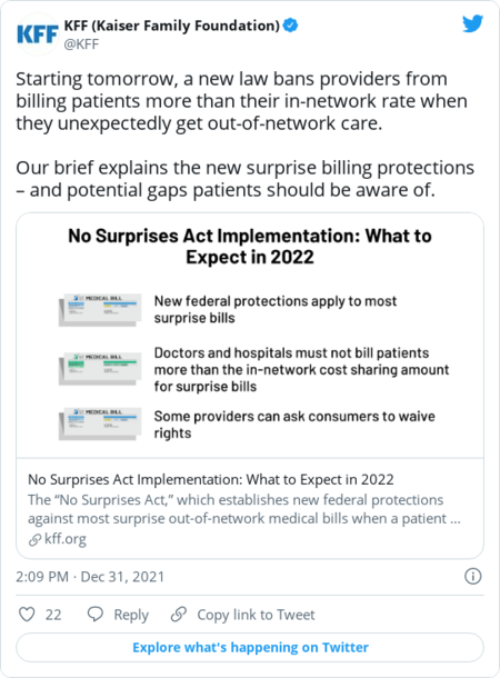 | | New year, and a new ban on surprise medical bills: Providers may no longer send patients many eye-popping bills for inadvertently seeking care outside of their insurance network. Congress passed legislation banning the practice in late 2020 after a years-long lobbying onslaught, and the Biden administration fleshed out the details last year. | | The Kaiser Family Foundation | | | | | | |  | Our top holiday reads | | - Prenatal tests initially focused on Down syndrome, but they've since expanded to include many more conditions. A large share of the positive results from these newer tests are incorrect, The New York Times's Sarah Kliff and Aatish Bhatia report.