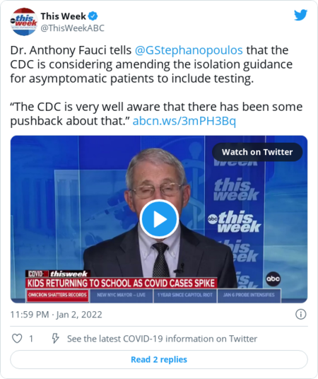 | | But now, health officials could change course. Fauci said Sunday that the CDC is considering adding a testing component, The Post's Jeff Stein reports. | | Fauci on ABC's "This Week": | | | | | | But Americans would need to be able to find tests. The holidays exposed the limits of the country's testing capacity, as appointments filled up and Americans scoured retail stores and the web to find rapid at-home tests. The administration says it's laying plans for two efforts aimed at making tests more accessible and affordable amid public frustration over their availability. While both add another tool to America's testing arsenal, neither completely solves the country's testing woes. | - Shortly before Christmas, Biden detailed a new effort to distribute 500 million free at-home tests. The first delivery is planned for this month, and the White House says it'll create a website to help Americans get the tests. It's unclear if more will be ordered after the half-billion are delivered.
