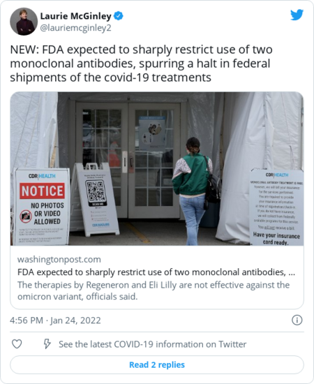 | | The Post's Laurie McGinley: | | | | | | The country has three monoclonal antibody therapies to treat the coronavirus. But two of the treatments are highly unlikely to be effective against the omicron variant, which is now responsible for more than 99 percent of coronavirus cases. | | There was some news on that front yesterday. | - The Food and Drug Administration took those two therapies off the list of covid-19 treatments for now, our colleague Laurie McGinley reports.