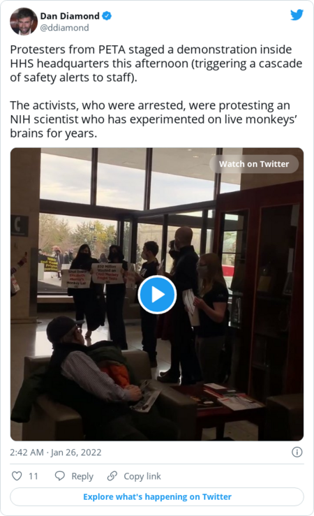 | | |  | From our reporters' notebook | | | Animal rights activists PETA mounted a protest inside HHS on Tuesday, triggering a cascade of safety alerts to staff (although many are working remotely, as several staffers pointed out to our colleague Dan Diamond). The protesters were arrested and removed, as captured on video; PETA told Dan that they were protesting an NIH scientist who has done years of research on live monkeys' brains. | | |  | Coronavirus | | DeSantis, White House spar over treatment that doesn't work against omicron | | White House press secretary Jen Psaki dismissed Florida Gov. Ron DeSantis's calls for monoclonal antibody therapies that have proved ineffective against the omicron variant. On Monday, the Food and Drug Administration took the two therapies off the list of covid-19 treatments for now, and the federal government halted shipments of the drugs. It's a move that led to an outcry from DeSantis, a Republican, and some others on the right. | - Psaki told reporters that the FDA has made it clear that those treatments "do not work against omicron and they have side effects." She also said the administration has sent Florida other treatments effective against omicron, our colleagues Mariana Alfaro and Lori Rozsa report.