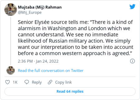 Is Putin bluffing on Ukraine? Allies in the U.S. and Europe are divided. A poster of Russian President Vladimir Putin is used as target practice along a trench on the frontline with Russia-backed separatists near Zolote village, in the Lugansk region, on Jan. 21. (Anatolii Stepanov/AFP) | When it comes to assessing the risk of a Russian invasion of Ukraine, there is a major geopolitical divide. The United States, along with its ever-close foreign policy ally Britain, has warned that Russian troops massing on the border of Ukraine suggest that Moscow could start a major conflict on European soil. And yet even with this risk, some European nations closer to the action remain skeptical. Germany has been particularly resistant to the prevailing wisdom in Washington and London. Berlin has ruled out supplying Ukraine with defensive weapons so far; British Royal Air Force planes even avoided German airspace when delivering antitank weapons to Ukraine, instead taking a longer route over the North Sea and Denmark. There are many reasons for the divide, but one key difference is in views of the Russian president and his intentions, according to Liana Fix, an expert on Russia at Berlin's Körber Foundation. Many in Europe think Vladimir Putin is bluffing, she said. "In Europe, the perception was that Russia is building up the military threat to gain concessions," Fix, currently on a sabbatical in Washington as a fellow at the German Marshall Fund, told me. "Whereas, the perception here seems to be that military escalation is perhaps the most probable path ahead." The stark difference was highlighted in remarks Friday by Germany's navy chief, who asked a think tank panel in New Delhi if they thought Russia was interested in having a "small and tiny strip of Ukraine soil" under its control? "No, this is nonsense," Vice Admiral Kay-Achim Schönbach said, before adding that "Putin is probably putting pressure on us because he can do it." Western nations should respond by giving the Russian leader the respect he craves — and deserves — the German naval leader continued. Schönbach offered his resignation Saturday after an international outcry. Such views are not as isolated as you may think. There are plenty of officials and experts who believe that Russia does not seek a conflict and its military buildup is a ploy designed to force concessions from the West. However, there is disagreement on whether his demands, which include an end to the eastern expansion of military alliance NATO, should be met. Historian and military strategist Edward Luttwak wrote on Twitter last week that Putin was "bluffing" on Ukraine as invading the country would start a war that it "cannot afford to fight." "To invade Europe's largest country with less than 200,000 troops would not end the crisis victoriously for Russia," Luttwak wrote, adding that even if no European country will send troops, "they will send weapons." Russia has surprised everyone and began major international aggression before under Putin — Chechnya from 1999, Georgia in 2008, Syria from 2015 and even not-so-covertly in breakaway regions of Ukraine from 2014 — and still frequently engages in lower-level international acts. But a full-scale invasion of an enormous country — which borders the European Union, is well-supplied with Western arms and has a largely hostile population — may be a very different proposition. Russian officials have capitalized on this uncertainty, accusing the United States and its allies of "hysteria" on Monday. Deputy Foreign Minister Sergei Ryabkov said last week that Russia would not take any aggressive actions at all. "We will not attack, raid or invade Ukraine," he told Russian media. And some European officials appear to have doubts about the U.S. and U.K. accounts, too. Speaking after meeting with Secretary of State Antony Blinken in Brussels, the European Union's top foreign policy official said countries need to avoid a "nervous breakdown" in their reactions to the situation. "We know very well what the degree of threats are and the way in which we must react, and no doubt we must avoid alarmist reactions," Josep Borrell said Monday. But others believe exactly the opposite: That it is the offers of diplomacy, not the threat of war, that is the bluff. Writing for the website War on the Rocks on Monday, Michael Kofman argued that Russia's demands the demands Russia was making simply could not be met by the United States and its NATO allies. "By publicizing its demands and refusing to unbundle them in ways that might achieve compromise, Russia has made its diplomatic effort appear more performative than genuine," wrote Kofman, director of the Russia studies program at the think tank CNA, later adding: "Perhaps Moscow is just fishing for what it can get, but the political demands do not align with the military side of the equation." In December, U.S. officials said they were seeing signs that Russia was preparing for a military offensive against Ukraine involving up to 175,000 troops. Since then, troops have been seen moving through neighboring Belarus, and Britain has warned of Russian plans to install a pro-Moscow government in Kyiv overthrow the Ukrainian government. "While we can't get into the mind of President Putin, we are seeing the preparations that they're making at the border," White House press secretary Jen Psaki said at a Monday briefing. Despite denying it was planning any military action, Russia has made a series of unilateral demands that would forestall Ukraine entering NATO and effectively limit NATO forces to the military bloc's 1997 borders, before its eastern expansion. The country has drafted agreements with the United States and NATO, with deputy foreign minister Ryabkov saying Monday the demands weren't a restaurant menu that could be chosen from. To many, the scope of those drafts suggests a lack of seriousness. "Few serious negotiations begin with one side drafting, let alone publishing, an