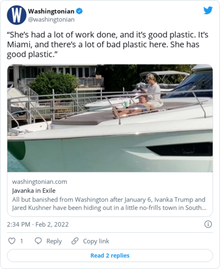 | | "A few months later, the woman bumped into the family once more — a rare kind of happenstance since the Kushners had sought exile in the Sunshine State." | - "Her encounters with Ivanka only reinforced a long-held impression: "She seems to be about … 'I live in this little cocoon where the rules don't apply to me' … in her own little world.'"