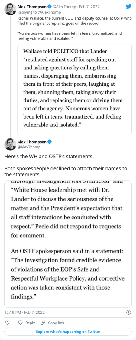 - The investigation also found "credible evidence of instances of multiple women" having complained about Lander speaking to them in a "demeaning or abrasive way" in front of staff.