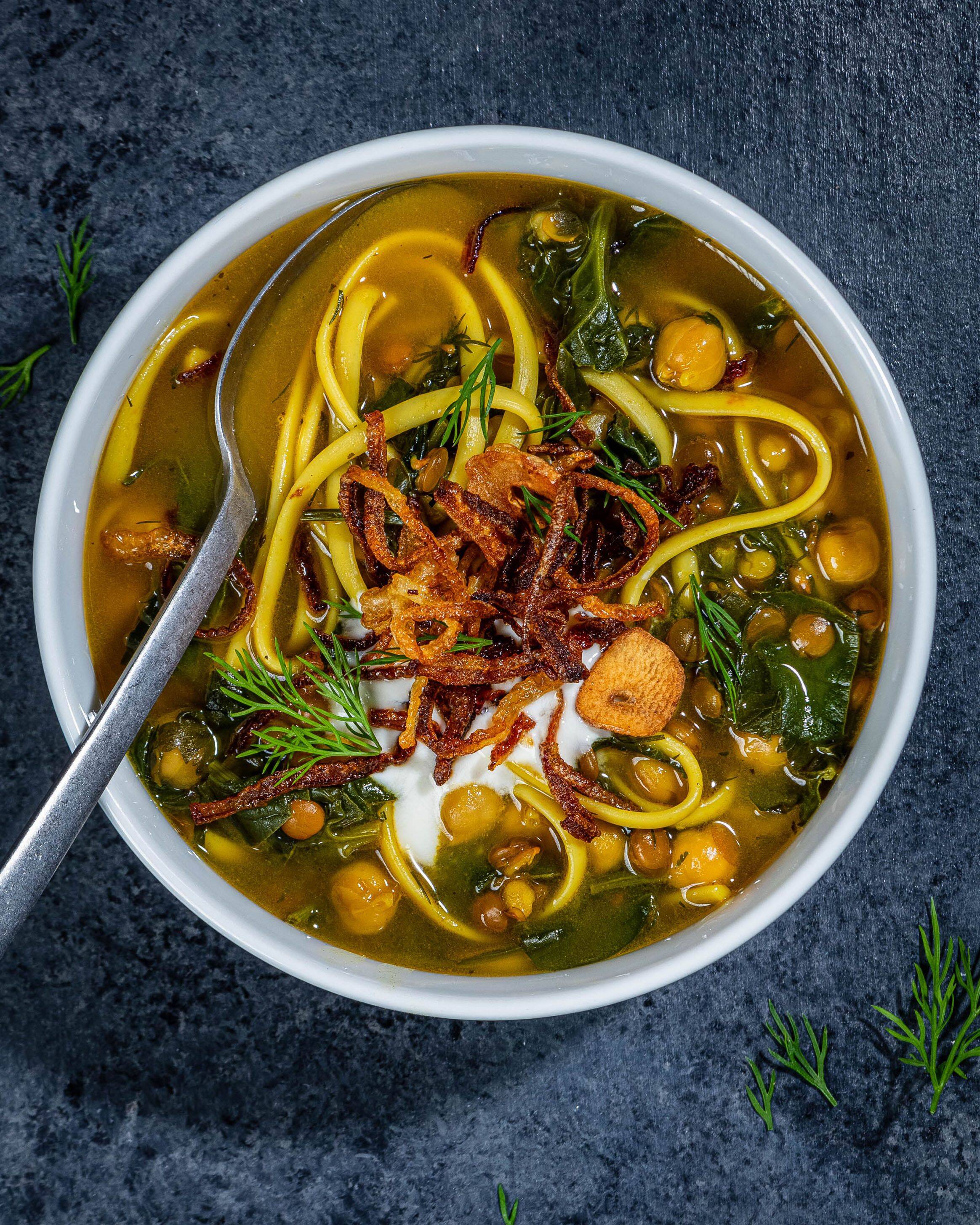 Storage: Refrigerate for up to 4 days.Make Ahead: The soup, without the noodles, can be made up to 3 days in advance. Cook the noodles separately, and add them to each bowl before serving. Want to save this recipe? View it on Voraciously here and click the bookmark icon below the serving size at the top of the page to add it to your Reading List. For easy printing and scaling, view this recipe in our Recipe Finder. Servings: 4 to 6 Active time: 45 mins Total time: 1 hour Ingredients - 1/4 cup ghee or olive oil, plus more as needed