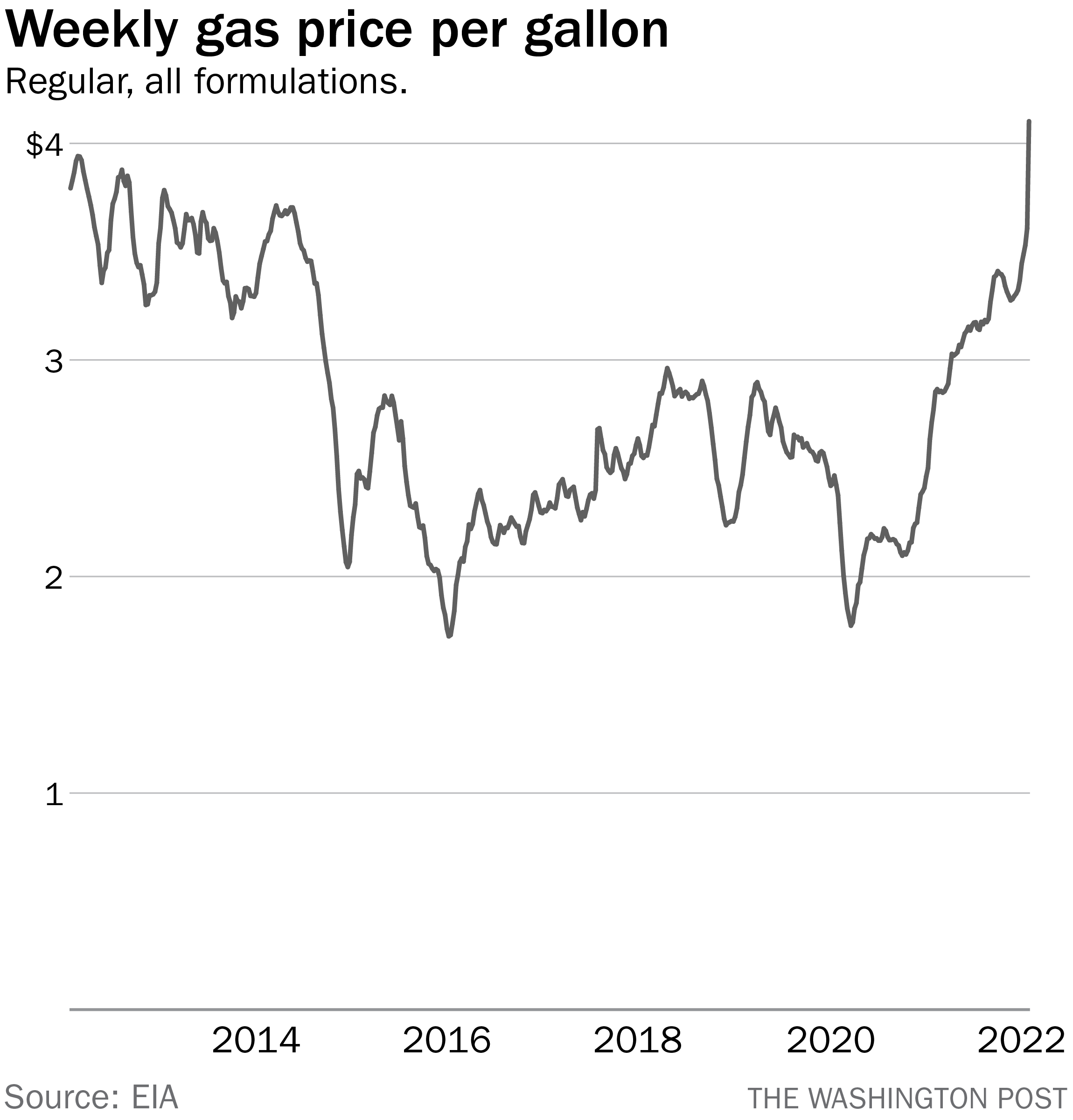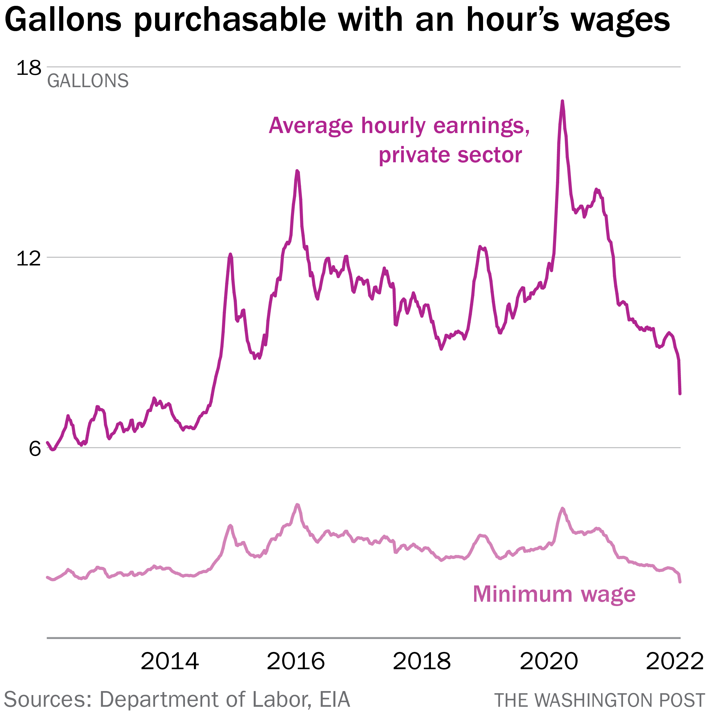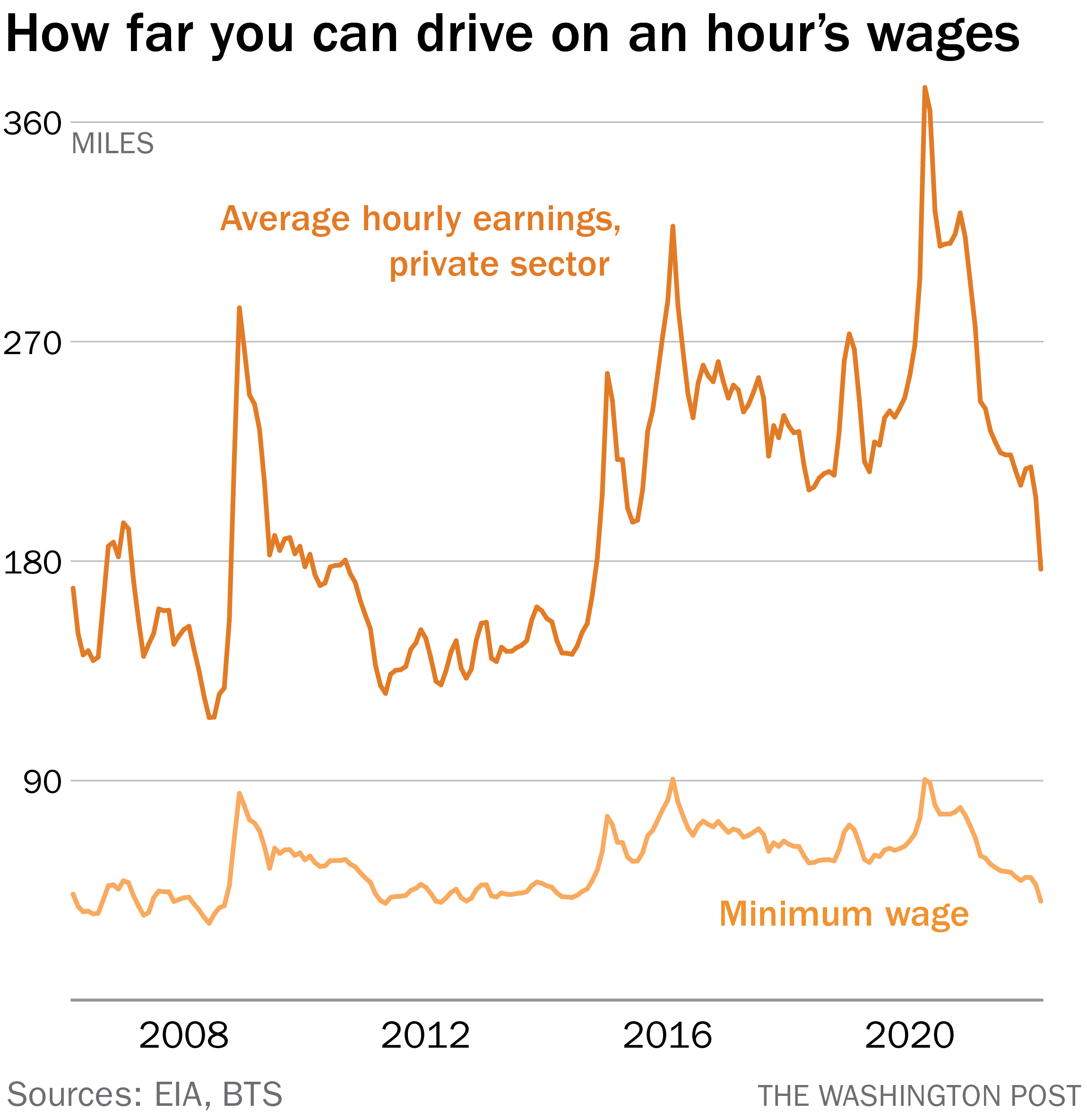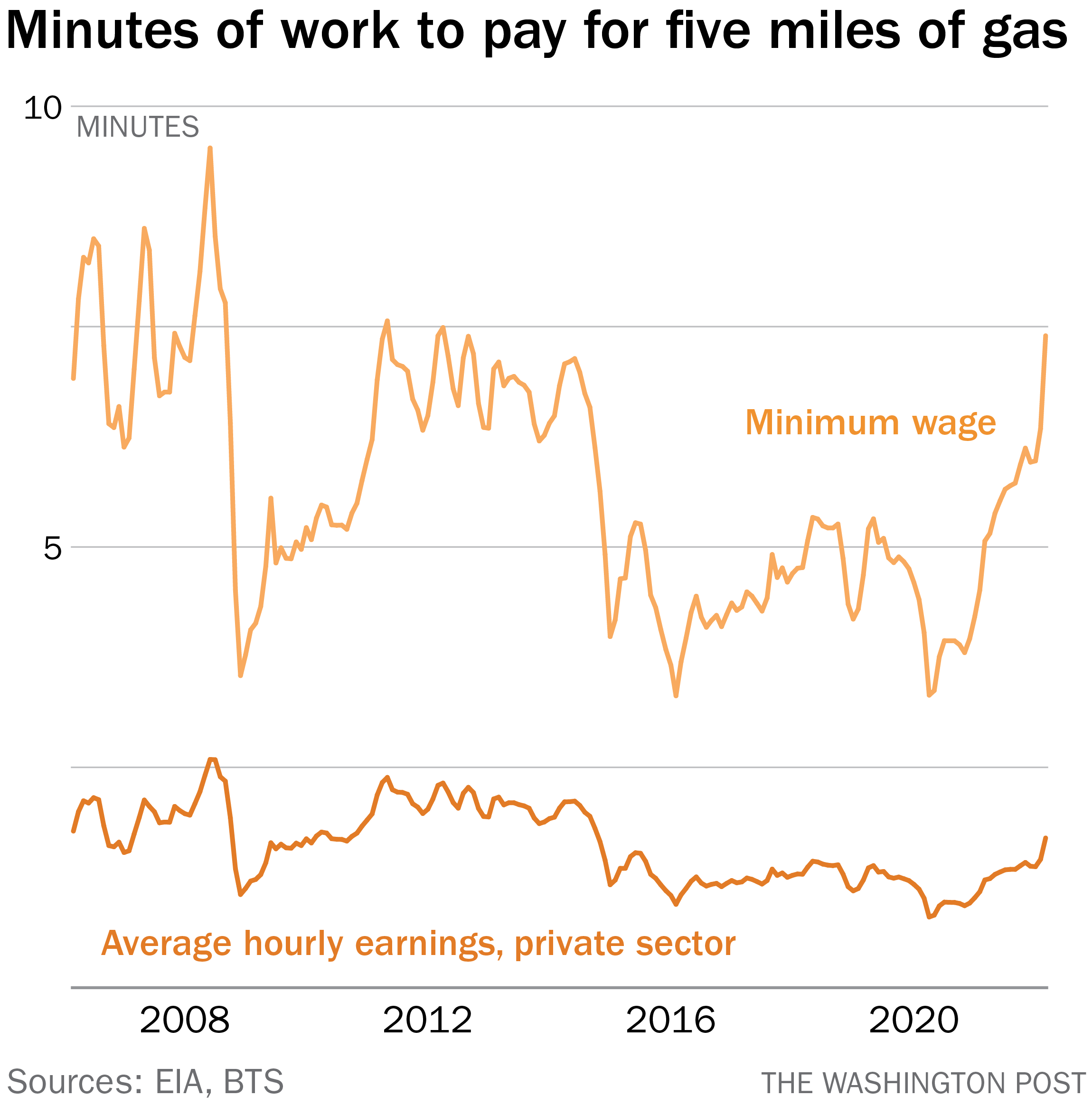 | Did a gasbuddy forward this to you? Sign up here. INTERIOR, A DARK NIGHTCLUB A spotlight shines on a wall covered with brick-patterned wallpaper. ME: (walking into spotlight) What's the deal with gas prices! (quiet coughing in the audience) ONE GUY: Boooo. (The booing is lethargic, hence the period.) YOU: Let him speak! ME: Oh, thank you. Appreciate your support. As I was saying, gas prices are a bit excessive. The economy has had no better luck shaking the effects of the coronavirus than have Americans in general, and a surge in per-gallon prices since the dip when the virus emerged two years ago has been boosted into high gear by the war in Ukraine, like a race car hitting the nitrous oxide. (This is an analogy born of playing video games, not actual knowledge about racing.) So… YOU: Chart! Chart! Chart! ME: Right, okay. Let's visualize that spike, using price data from the Energy Information Administration. This is one of those charts that you could show to the world's least chart-savvy person and they would say, hmm, that doesn't look great, and they would be right. But notice a few things here. The first is that while the increase is dramatic, the actual price per gallon isn't significantly higher than it was about nine years ago. Not that this is good, mind you, but it is a reminder that increases and changes in monetary values over time should be contextualized with changes in spending power over the same period. Or, to put it more bluntly: We should consider the cost of gas relative to what people actually earn. I will admit that this idea was proposed to me by a reader last week and that I then saw a tweet from economist Justin Wolfers that compared gas prices to wages over time. After all, while the minimum wage hasn't changed over the past decade (booo) the average hourly wage measured by the Department of Labor has (yay). So we can reframe our initial graph by considering a different metric: how much gas you could buy with an hour's work at the minimum and average wages. In short, even with the recent spike, you can buy more gas with an average hour's salary now than you could in 2013, thanks to the increase in how much people make. (You can buy about the same amount at minimum wage, since it hasn't.) But, more useful to consider: You can buy a lot less than you could two years ago. Not that we want to rewind the clock to early 2020, given how little interest I think we all have in reliving the past two years, but it's still important to recognize that increased wages even since then haven't softened the effects of the increase in gas prices much. For fun ("fun"), let's invert this calculus. At this point in 2020, it would have taken you about 20 minutes of work at minimum wage to buy a gallon of gas. Now it would take you more than half an hour. After seeing Wolfers's tweet, I saw another from The Washington Post's own Catherine Rampell. She pointed out another relevant factor here: the improvement in fuel efficiency in cars. And, sure enough, the Bureau of Transportation Statistics — one of those government agencies with a name that could not possibly be more on-the-nose — has measures of average fuel efficiency by year over time. (The most recent year included is 2020; for our purposes, we'll just pretend things haven't changed.) So now we can measure not just how much gas one can buy for an average wage but how far it will take you. And that's really the point, right? We don't buy gas just to marvel at its beauty or aroma. We buy it to go places or to make wildly irresponsible bonfires. So if we overlay fuel efficiency, we see a slight shift in our metrics. At the beginning of 2020, you could drive 250 miles in an average-fuel-economy car for an hour's work at an average-hourly-wage job. Now? 177 miles. Or, to again invert the calculus, it will take you about seven minutes, 30 seconds of work at minimum wage to afford enough gas to drive five miles. At the beginning of the pandemic, it would have taken you less than five minutes. These changes are subtle, certainly, but small changes in the price of gas both have ripple effects in the economy (as transportation costs for everything else increase) and an outsize effect on lower-income Americans for whom gasoline eats up a much larger percentage of income. In the abstract, these differences in the number of minutes needed to buy gas are small, but they mean additional dollars pulled out of limited budgets, which is really the point. Prices seeming less-bad when compared to 2012 is not much consolation if you're trying to buy milk. And, of course, gas prices appear to be poised to increase further. I recommend not standing outside of Shell showing people charts to suggest that things were slightly worse nine years ago. You may not get the response you expect. |