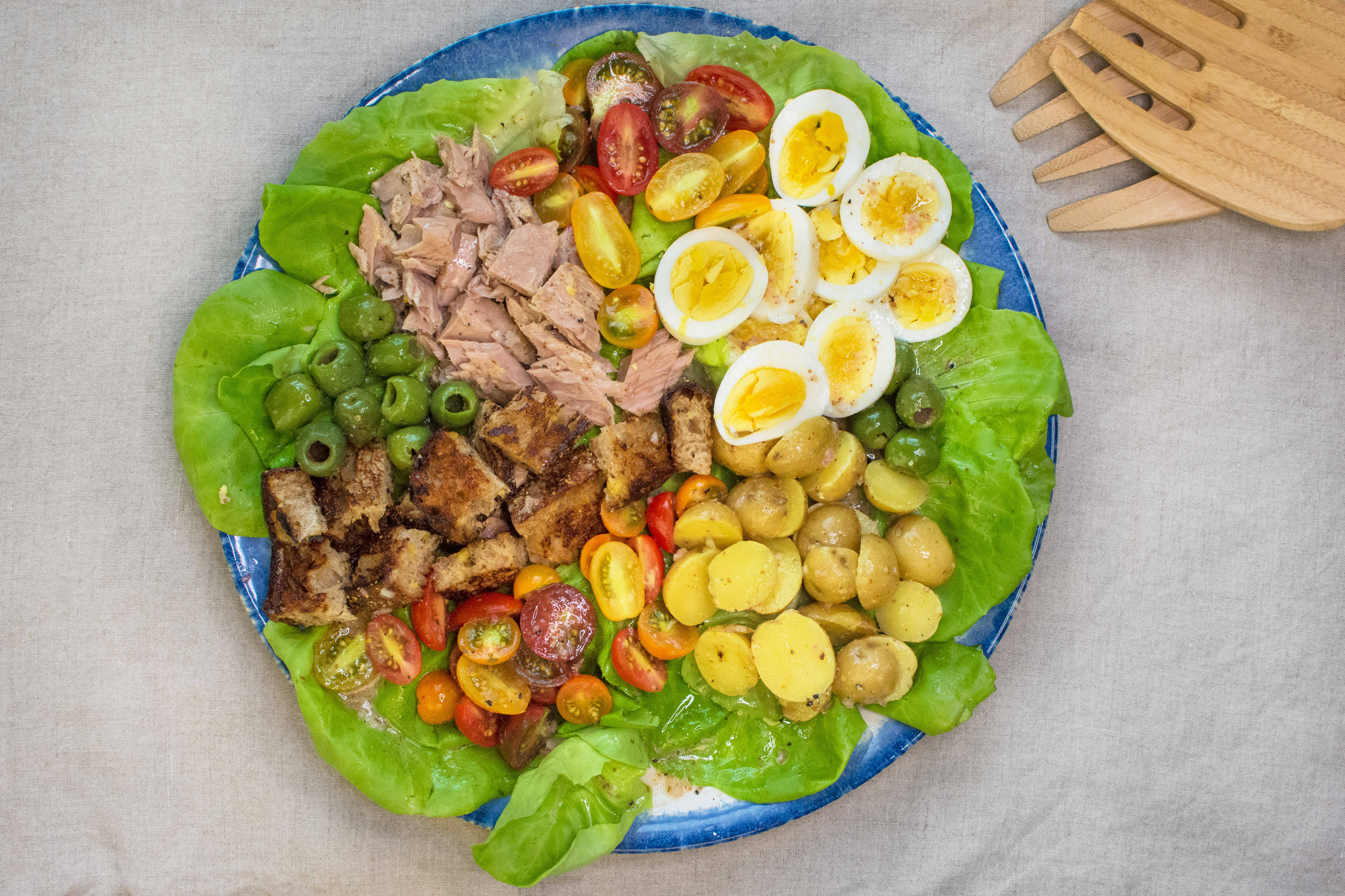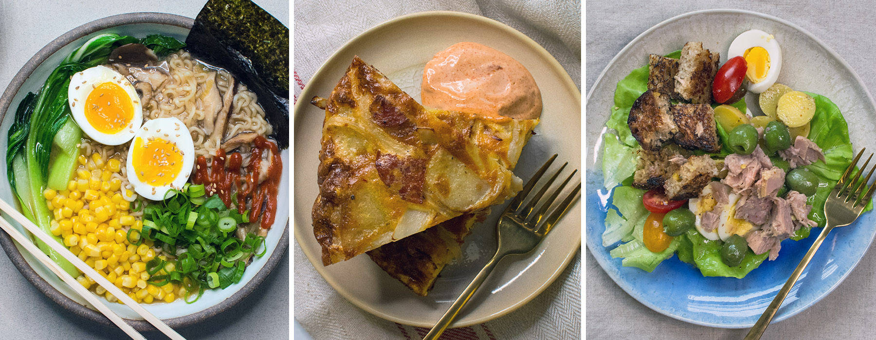 Nicoise-y Salad This everything-but-the-kitchen-sink spin on a French favorite makes elegant use of fridge and pantry odds and ends.  | Your shopping list | Are you all in this week? Click this link for an easy-to-save shopping list that includes ingredients for all three recipes.  | Sunday task | Boil those eggsLet's talk about the ultimate boiled egg. The shell peels off with ease and exposes a perfectly set egg white, that's a given. But you'll have to slice that baby in half to discover the true treasure you seek: a golden pot of what can only be described as "jammy" yolk — not quite set, not quite runny, but quite perfect. You, too, can achieve yolk nirvana with the help of your phone or FitBit's stopwatch, as the trick is entirely in the timer. To get things started, take five large eggs from a carton (the other seven are for your Tortilla EspaƱola later this week). Fill a pot with enough water so the eggs will be completely submerged once you add them, then bring it to a boil. Stir in a three-finger pinch of salt and a splash of white wine vinegar, rice wine vinegar or apple cider vinegar.  | Quick tip | Life's experiences (and my mom) have taught me that a splash of vinegar helps the shell cleanly release from the cooked egg. Science says it's because vinegar (an acid) softens — and would eventually dissolve — the eggshell (calcium carbonate), making it easier to peel off without taking some egg with it. Carefully lower the eggs into the boiling water and adjust the heat so that it's slightly bubbling as opposed to a hardcore rolling boil. Set your stopwatch as soon as the eggs make contact with the water and cook for 7 minutes. Prepare a bowl of water with ice cubes in a medium bowl while the eggs do their thing. At exactly the 7-minute mark, transfer two of the eggs from the boiling water to the ice-water bath to cool down: These are the jammy-yolk guys you'll want for Cozy Ramen this week. Keep the stopwatch going. At the 9-minute mark, pull the three remaining eggs from the cooking water. These will be just on the edge of hard-cooked and perfect for a salad. Remove the 7-minute eggs from the ice-water bath and add in the 9-minute eggs. I like use pencil or Sharpie to mark a small "7" on the shells of the first two eggs so that I don't mix them up with the uncooked one when they all go back into the carton. Mark a small "9" on the last batch as well after a few minutes in the ice-water bath.  | Recipes | Cozy RamenLet's throw it back to Week 2 for a hot second. Remember tare? Tare is the flavor force in ramen, too, and it determines what "type" of ramen you order at a restaurant. Shoyu ramen is flavored with a soy-based tare, which is what we're whipping up. Ramen is endlessly riffable, so don't feel limited by the ingredients list; use what you have. And for the love of all that is good and decent, please throw out the flavor packets that sometimes come with dried ramen noodles before you get started. Ingredients2 servings Prep time: 5 to 10 minutes. Cook time: 25 minutes. 2 tablespoons low-sodium soy sauce 1 ½ teaspoons mirin 3 ounces dried ramen noodles 1 tablespoon vegetable oil 1 head baby bok choy, trimmed, stalks separated and sliced lengthwise 4 ounces sliced shiitake mushrooms Kosher salt 1 teaspoon peeled, freshly grated ginger root 4 scallions, greens and whites separated and thinly sliced 2 1/2 cups chicken broth (ideally homemade, but *extremely Ina Garten voice* store-bought works just fine) ¼ cup cooked corn kernels (canned or frozen/defrosted) 2 jammy 7-minute eggs, sliced in half (from Sunday!) ½ sheet of nori (dried seaweed), cut into thin strips (optional) Sriracha StepsWhisk together the soy sauce and mirin in a small cup; this is your tare. Those flavors need a little time to get to know each other, so let them bond while you get the noodles and vegetables going. Boil some water in a saucepan, add the noodles and cook them according to the package directions, which could take 2 to 4 minutes. I'd shave off a minute or so; they'll end up softening more in the hot broth. Once they're done, you can drain and divvy 'em up between serving bowls. Meanwhile, drizzle a teaspoon of the oil in a separate saucepan over medium heat. Add the bok choy and cook for about 3 minutes, until the stalks are slightly softened and the leafy tips are wilted. Transfer 'em to a plate. Heat the remaining oil in that same saucepan over medium heat. Add the mushrooms, season them with a pinch of salt and cook for 3 minutes, or until they release some moisture. Toss in the grated ginger and scallion whites and cook for 2 minutes more, stirring frequently. Pour in the broth and bring everything to a boil. Once things are literally and figuratively rolling, give the everything a quick whisking and drop the heat down until the liquid is just simmering. Cook for 5 minutes, remove the saucepan from the heat and stir in the soy and mirin mixture. Add the cooked bok choy and corn to the bowls. Ladle the ramen broth over, which will warm them all up and help separate the noodles if they're a little sticky. Dress up the bowls with the eggs. Garnish with nori strips, if using, the scallion greens and a healthy squeeze of Sriracha to really warm you from the inside out. Tortilla EspaƱola With Indecisive AiolisMy mom whipped up many a tortilla for dinner when I was growing up. Her mom — my abueti — had let her in on a little secret, which she passed on to me and I will pass on to you: You don't have to flip the still-runny tortilla as you cook it, which is traditionally how it's made. Instead, you can finish it off under the broiler, then invert it onto a plate when it's all said and done. While purists may shake their heads about this, there is no Tortilla Police to come kick down your door. The eggs are but a binder for what you're really here for: potatoes and onions and cured Spanish chorizo, if you eat meat. You really only need seven large eggs to get the job done. Ingredients