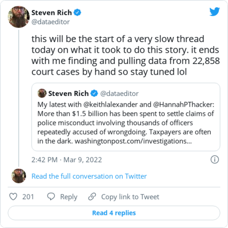 | Accurate and complete national databases on policing are few and far between. So when we wanted a database of civil payments for alleged police misconduct, we had to build one ourselves. Because the federal government has no way to compel all of the more than 18,000 law enforcement agencies across the country to provide data, anything it collects tends to be spotty — and even at the local level, some data points simply aren't collected. As an investigative data reporter here, this is a problem I've come to anticipate. So when I want to know something, I lean on open records laws. Every state has its own — sometimes called a sunshine law — designed to help citizens better understand their government by providing a level of transparency and access to the public's business. We used these laws to file requests for information from the cities and counties with the largest police and sheriffs' departments when our team wanted to explore which officers were repeatedly the subjects of citizen claims of alleged misconduct. Many requests were denied. More than a year later, some are still being processed. In the end, we were able to get data covering 25 departments. I've discussed some of the hurdles we had to overcome on Twitter. One of the things that struck me was how few (just eight) of the cities and counties were able to provide the names of officers in their data. The records provided often had some details — such as an incident date or a court record number — but were lacking the information that would help us reveal and report how many officers were the subject of repeated misconduct claims. To conduct this investigation, I manually hunted down every lawsuit where we didn't have an officer's name attached to a claim. At the end of the day, I found names in 22,858 legal cases, and combined that data with the records from a few cities that provided officer names. This created a final database of claims with officers' names attached, allowing us to identify more than 7,600 who were named in multiple misconduct cases between 2010 and 2020 — and the cost to taxpayers. This isn't the first time The Post has had to create its own policing data for an investigation, since city and federal records are so incomplete. We've done it several times before to reveal the true toll of police shootings and how policing works — and often doesn't — in America. And it's unlikely this is our last foray into the space. Read our latest story about the hidden billion-dollar cost of police misconduct, then see if your city is in our database. (The Washington Post) More than $1.5 billion has been spent to settle claims of police misconduct on behalf of thousands of officers repeatedly accused of wrongdoing. Taxpayers are often in the dark. Exclusive ● By Keith L. Alexander, Steven Rich and Hannah Thacker ● Read more » | | | | | The situation in Ukraine seems destined to result in an even deadlier and more protracted slog, wreaking devastation in the country and resulting in a massive humanitarian crisis. By Ashley Parker, John Hudson, Michael Birnbaum and Paul Sonne ● Read more » | | | | (Salwan Georges/The Washington Post) With astonishing speed, Ukraine shifts from normal life to fighting off an invading army. By Max Bearak and Isabelle Khurshudyan ● Read more » | | | | | Jeffrey Sonnenfeld has spent decades pushing executives to act to benefit society. By Tracy Jan ● Read more » | | | | | Wendy Rogers, who recently drew a rare official rebuke from fellow Republicans, has raised millions from out-of-state donors By Beth Reinhard and Rosalind S. Helderman ● Read more » | | | | Some pieces they couldn't play. Too many musicians had either fled or joined the fight against Russia. By Sudarsan Raghavan ● Read more » | | | Brittney Griner's family, her agents, officials from the WNBA and top U.S. government officials have been mostly silent about her situation. That could be strategic, experts say. By Dave Sheinin ● Read more » | | | | This personal pandemic check-up shows how many Americans share your experiences. By Derek Hawkins, Alyssa Fowers, Madison Dong, Dan Keating and Simon Ducroquet ● Read more » | | | | (Kate Woodsome/The Washington Post) An intimate documentary about the growing crisis of Americans held hostage by foreign governments, "Bring Them Home" follows one family's desperate effort to free their loved one from being a geopolitical pawn. Opinion ● By Kate Woodsome and Ray Whitehouse ● Read more » | | | | The pandemic and the rise in remote work have prompted a switch to comfy attire — which means underwire bras may be on the decline. By Karen Heller ● Read more » | | | |