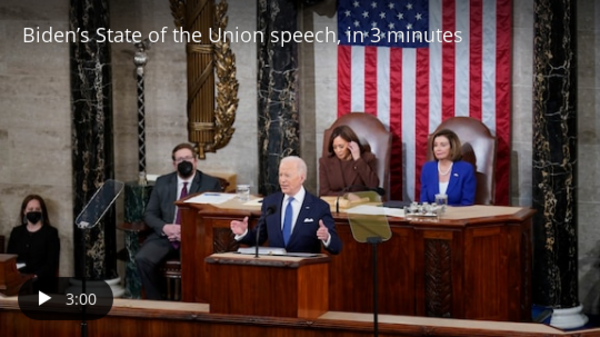 | President Biden delivered his first State of the Union address. | - Main takeaways: He condemned Russia's invasion of Ukraine; promised to fight inflation and "fund the police," rather than defund them; and said covid "no longer need control our lives."