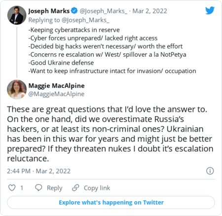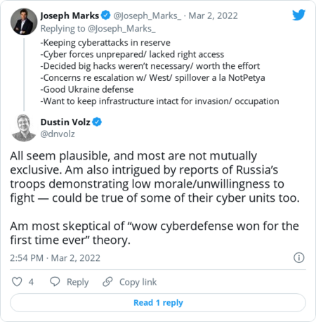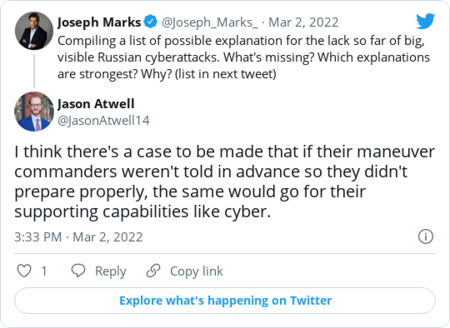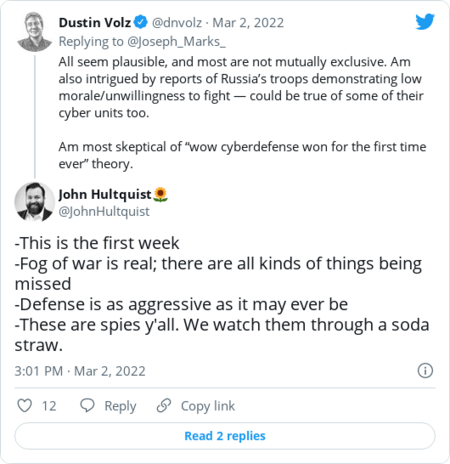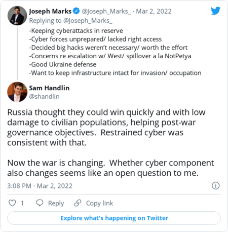 | Welcome to The Cybersecurity 202! Sinclair Lewis won the Pulitzer Prize for "Arrowsmith" on this day in 1926 — but refused to accept it. Check out this great recent assessment of Lewis in the New York Times Book Review. Below: The Conti ransomware gang is shutting down some operations after a devastating data leak, and hackers are targeting groups helping Ukrainian refugees. | There are many possible reasons why Russia isn't cyber-pummeling Ukraine (yet) | The scene of a fire at the economy department building of Karazin Kharkiv National University in Kharkiv, Ukraine, allegedly hit during recent shelling by Russia. (Sergey Bobok/AFP/Getty Images) | | | Russia's brutal military campaign in Ukraine has not been accompanied so far by the sort of cyberwar many experts expected. They'd expected the invasion to be accompanied by dramatic hacks shutting off power, jamming communications and bringing industries to a standstill, after years of watching Russia testing some of its most dastardly and damaging cyberattacks in Ukraine. There have been Russian hacks, to be sure, including some that wiped data from computers at Ukrainian government offices and in key industries — but nothing that's seriously impeded Ukraine's ability to mount a resistance. Here are 11 theories why Russian cyberattacks haven't been worse. (Obviously, the truth could be a combination of several of these). 1. Just keep waiting — they're keeping the good stuff in reserve. This is the easiest explanation and a popular one among cyber watchers. We're just one week into the invasion, after all, and a lot can still change. Russia may be holding some significant cyberattacks in reserve for when it really needs them or to undermine some particular aspect of the Ukrainian defense. | | One problem: If an attacking army is going to use cyberattacks, the most useful moment is probably at the beginning of the operation when it can do the most to undermine, confuse and demoralize the adversary, Jake Williams, a former National Security Agency hacker, told Joseph Menn and Craig Timberg recently. | | More from Jay Healey, a cyber scholar at Columbia University: | | | | | | 2. Big hacks are happening that we just don't know about. This is another popular theory. Some of the most useful work Kremlin hackers could be doing now is surveillance and reconnaissance for military fighters — a lot of which Ukrainians may not have spotted or might not share if they did. However: That still doesn't explain the absence of disruptive and destructive hacks, such as shutting off electricity and jamming communications that are public by default. | | John Hultquist, threat intelligence lead at the cybersecurity firm Mandiant: | | | | | | 3. Russian hackers weren't prepared for the invasion. This could be because the invasion plan was a secret held only by the top ranks of political and military officials and not shared with front-line hackers in Russia's intelligence agencies. | | Jason Atwell, Mandiant principal adviser for global intelligence: | | | | | | 4. Russia didn't think big cyberattacks were necessary. | | There are indications that Russian President Vladimir Putin did not expect the amount of resistance Russian troops encountered. His war planners may have believed that major cyberattacks would be an unnecessary distraction from a quick military campaign. | | Swarthmore University political science professor Sam Handlin: | | | | | | 5. Major cyberattacks just aren't that useful during a shooting war. That's the conclusion of a lot of close observers of recent military conflicts — essentially that a cyberattack is a far more complicated method to do something that could be done more easily with conventional weapons. Here's an except from a forthcoming article shared with me by the scholars Erica D. Lonergan, Shawn W. Lonergan, Brandon Valeriano and Benjamin Jensen: "The reality is that even the most sophisticated offensive cyber operations do not have the kind of decisive effect on an adversary's military capabilities when compared to conventional munitions. Put simply, it's far easier to target the other side's capabilities with artillery, mortars, and bombers than with exquisite and ephemeral cyber power." The scholars Lennart Maschmeyer and Nadiya Kostyuk made a variation of this argument in a recent War on the Rocks article. They noted that a series of explosive Russian cyberattacks against Ukraine — including one that briefly shut off power for thousands of people in 2015 — have done little to weaken Ukrainians' desire to lean to the West or served other Russian interests. 6. Fear of escalating cyber tensions with the West. This could certainly explain why we haven't yet seen significant hacks against the United States or its allies in response to several rounds of punishing sanctions. It may also make the Kremlin more anxious about indiscriminate cyberattacks that are aimed at Ukraine but could leak out and cause damage elsewhere. That's what happened with the 2017 NotPetya bug, which Russia aimed at Ukrainian energy firms but leaked out and caused severe damage in other nations. However: Putin's decision to put Russian nuclear forces on alert suggests he's not overly concerned with escalating tensions now. | | Maggie MacAlpine, security strategist at Cybereason: | | | | | | 7. Russia wants to keep Ukraine's infrastructure intact for a future occupation. This could be especially true if Russia is preparing to occupy Ukraine for a long period and is wary of cyberattacks that could do long-term damage to the nation's industries and economy. 8. Ukraine's cyber defenses are working. The nation has been girding its cyber defenses since the 2014 invasion of Crimea. More recently, U.S. government cyber advisers have helped close some remaining digital gaps. But it's still tough to believe that Kremlin hackers — who are among the most talented in the world — couldn't cause severe damage if they wanted to. 9. Global cyber defen