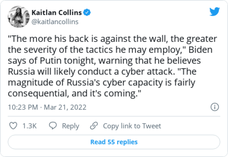 | Welcome to The Cybersecurity 202! I've seen "The Power of the Dog," "Licorice Pizza," "Drive My Car," and "Don't Look Up," so far this year, and I'm not rooting for any of them for Best Picture yet. Is there a better one in the mix? Below: The online verification firm Okta says there's "no ongoing malicious activity" after hackers claim to access networks connected to the company, and NSO's old owners are fighting in court with its new owners. | The White House wants critical-sector companies to be on high alert | Anne Neuberger, deputy national security adviser for cyber and emerging technology, speaks during a White House daily press briefing. (Alex Wong/Getty Images) | | | The White House has issued its starkest warning that Russia may be planning cyberattacks against critical-sector U.S. companies amid the Ukraine invasion. There's "evolving intelligence" that the Kremlin is actively exploring its cyberattack options, President Biden said in a statement, warning that companies have a "responsibility to strengthen the cybersecurity and resilience of the critical services and technologies on which Americans rely." Deputy national security adviser Anne Neuberger described the alert as a "call to action" for companies to raise their cyber defenses, during a White House press briefing. She tied it to a series of U.S. intelligence releases in recent months aimed at shining light on Russian planning. Biden later warned that he believes a Russian cyberattack "is coming" per CNN's Kaitlin Collins: | | Context: The alert comes after Russia has lobbed a series of digital attacks at the Ukrainian government and critical industry sectors. But there's been no sign so far of major disruptive hacks against U.S. targets even as the government has imposed increasingly harsh sanctions that have battered the Russian economy. | - The public alert followed classified briefings government officials conducted last week for more than 100 companies in sectors at the highest risk of Russian hacks, Neuberger said. The briefing was prompted by "preparatory activity" by Russian hackers, she said.