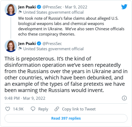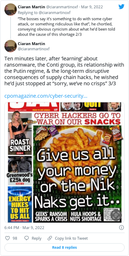 | | Disinformation watch: White House press secretary Jen Psaki accused Russia of being behind a disinformation campaign promoting the idea that the United States funded biowarfare facilities in Ukraine: | | The European Union also played down the Russian reports, saying that "the credibility of information provided by [the] Kremlin is in general very doubtful and low," Reuters reports. | | |  | Chat room | | | That feeling when the U.K.'s former top cyber official drops into your pub and asks for some crisps: | | |  | Global cyberspace | | The Internet's elders have an idea for blocking Russian military, propaganda sites | One leading idea is to give major online networks a blacklist of sites. (Dado Ruvic/Reuters/Illustration) | | | In an open letter, veteran Internet activists have proposed a new working group to consider what they call technical sanctions that could disrupt Russian military and propaganda sites but leave intact ordinary civilian sites like those used by news organizations, schools and hospitals, Craig Timberg reports. While the details of such a move haven't been worked out yet, one leading idea would be to give major online networks a blacklist of sites to avoid, a technique that is also used to block sites with malware and spam. The experts' letter rejects the idea of disconnecting an entire country from the Internet. That echoes the position of the Internet governance nonprofit ICANN, which previously rejected Ukraine's proposal to revoke the ".ru" domain and help get rid of their security certificates, which would have made it more difficult for people within Russia to access sites outside of the country. "Sanctions should be focused and precise," the letter says. "They should minimize the chance of unintended consequences or collateral damage. Disproportionate or overbroad sanctions risk fundamentally alienating populations." It was signed by activists, politicians, networking experts, security researchers and others. | | |  | Government scan | | Biden orders sweeping review of cryptocurrencies | President Biden is seeking to update cryptocurrency regulations. (Ting Shen/Bloomberg News) | | | An executive order from President Biden yesterday aimed at updating the government's cryptocurrency regulations could be a boon for efforts to combat ransomware, which relies on the digital currency. Here's more from The Post. | | |  | Securing the ballot | | | |  | Industry report | | | |  | Cyber insecurity | | | |  | Daybook | | - The Senate Intelligence Committee holds its worldwide threats hearing today at 10 a.m.