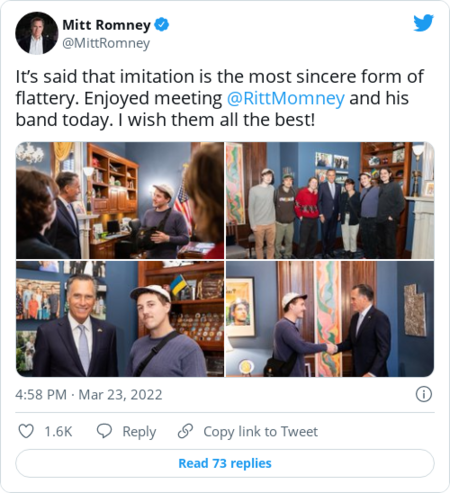 | | Some context: Pomerantz and Carey Dunne, another top investigator on the team probing Trump and the family-run Trump Organization, "abruptly left the office after people familiar with the matter said District Attorney Alvin Bragg (D) appeared uninterested in pursuing a case." | | |  | Hot on the right | | The call to get Ukraine more drones | | Here's the pitch from the Bulwark's Jim Swift: "Drones are a force multiplier—a way for even modestly sized militaries to pursue combined arms strategies. And looking at the battlefield in Ukraine, it's pretty obvious that the Ukrainians are using drones to good effect as well." Thoughts form the Pentagon: "Earlier this month, a Pentagon official said on background that Ukraine was 'terrific' with drones, and they needed more of them, rather than fixed-wing aircraft." The West has already given Ukraine quite a few drones, Swift explains, but he says it ought to offer up even more. | | |  | Today in Brussels (all times eastern) | | | Biden will participate in a European Council summit at 12 p.m. He will also deliver remarks. At 3 p.m., Biden will hold a news conference. | | |  | In closing | | Mitt Romney, meet Ritt Momney. | | In spoonerism news: The senator from Utah met Salt Lake City musician Jack Rutter (better known as Ritt Momney) and his band Wednesday. We wonder what that conversation was like. | | Thanks for reading. See you tomorrow. | | |