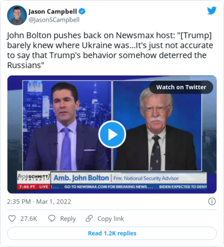 - "In almost every case, the sanctions were imposed with Trump complaining about it and saying we were being too hard," Bolton said. "The fact is that he barely knew where Ukraine was. He once asked John Kelly, his second chief of staff, if Finland were a part of Russia. It's just not accurate to say that Trump's behavior somehow deterred the Russians."