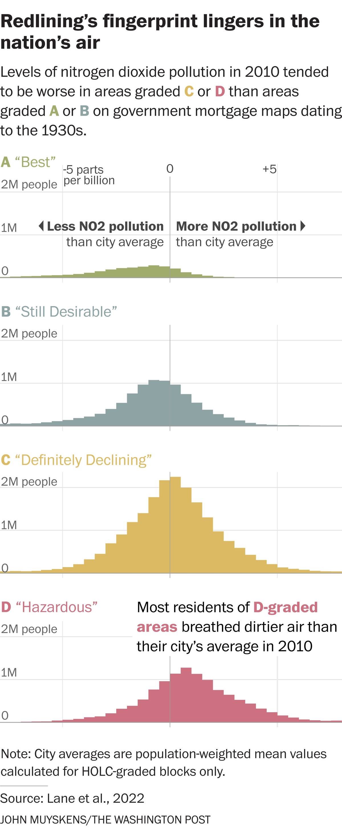 | | |  | The Data | | | The environmental consequences of redlining, visualized: "Decades of federal housing discrimination did not only depress home values, lower job opportunities and spur poverty in communities deemed undesirable because of race," our colleague Darryl Fears writes. "It's why 45 million Americans are breathing dirtier air today, according to a landmark study released Wednesday." | - "The analysis, published in the journal Environmental Science and Technology Letters, found that, compared with White people, Black and Latino Americans live with more smog and fine particulate matter from cars, trucks, buses, coal plants and other nearby industrial sources in areas that were redlined. Those pollutants inflame human airways, reduce lung function, trigger asthma attacks and can damage the heart and cause strokes."