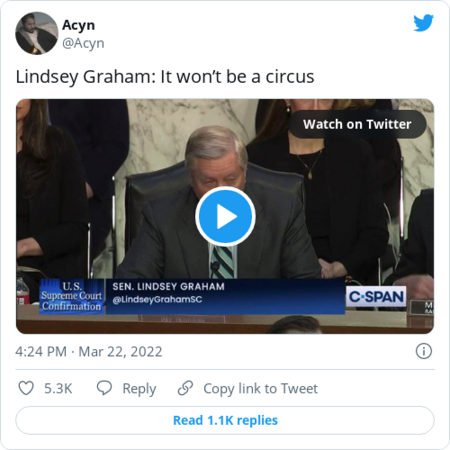 - "None of those issues were connected to cases coming before the Supreme Court — or to cases ever decided by the court," the New York Times's Jonathan Weisman and Jazmine Ulloa write. "They were amplified outside the chamber by institutional Republicans and the conservative media. Fox News ran a headline reading 'Ketanji Brown Jackson serves on board of school that promotes critical race theory,' and the Republican National Committee shared a GIF on Twitter showing the judge's picture with her initials, 'KBJ,' crossed out and replaced by 'CRT.'"