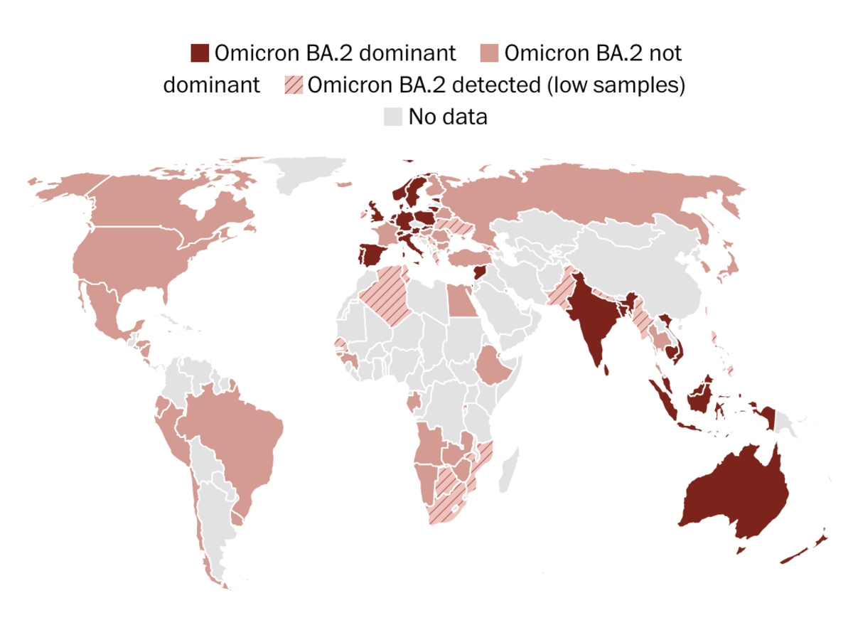| | The vaccine maker plans to submit the data on children 6 months to 5 years old to the Food and Drug Administration in the coming weeks. Quickly spreading BA.2 variant arrives in U.S. amid loosening restrictions | | Here's where BA.2 is spreading around the globe: | | | The recently emerged BA.2 version of the coronavirus accounts for about a third of new infections nationally, but disease experts said that the variant could take over as the dominant strain in a matter of weeks, our colleague Joel Achenbach reports. Catch up quick: | - In some areas of the country, as much as 70 percent of new cases are being attributed to the transmissive variant that has fueled a surge across Europe in recent weeks, according to an estimate from the genomics company Helix.