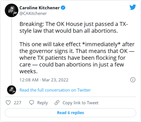 | | Feinstein's questioning comes as the high court seems inclined to uphold Mississippi's 15-week ban on abortion, which would undermine Roe v. Wade's nearly half-century old protections. The decision is expected this summer, before Jackson would be seated on the bench, if confirmed. | | The GOP-controlled Oklahoma House approved a Texas-style measure Tuesday to ban all abortions unless necessary for saving the pregnant person's life, The Post's Caroline Kitchener reports. The bill, if passed by the Senate and signed into law, would go into effect immediately after the governor signs it. | | More from Caroline: | | | | | | |  | Sugar rush | | | Thanks for reading! See y'all tomorrow. | |