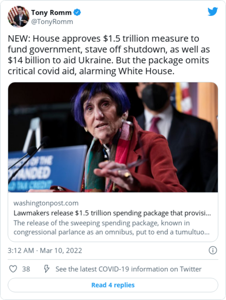 | Welcome to Thursday's Health 202, where we're thinking about this quote from "Veep": "Well now it's time for me to punch a clock — with a hammer." (Wondering why? Read on to find out.) Today's edition: The House passed a long-term deal to fund the government. At least three people were killed, including a child, in a Russian airstrike on a maternity hospital, another grim moment in the escalating conflict. But first… | Getting more coronavirus funds just got a lot harder for Democrats | House Speaker Nancy Pelosi removed additional coronavirus funding amid lawmaker disputes. (Photo by Jabin Botsford/The Washington Post) | | | Congress passed a bill last night to fund the government – without billions of dollars to combat the pandemic. That means lawmakers have lost their clear pathway to deliver the additional coronavirus funds the White House says are urgently needed. The effort is a stunning turnabout after congressional negotiators worked for weeks to hash out a deal to quickly get $15.6 billion for vaccines, therapeutics and global pandemic efforts to President Biden's desk. The White House warns it needs new money immediately to "avoid severe disruptions" to the country's pandemic response. The state of play: | - In recent weeks, Republicans demanded that the new coronavirus aid be paid for in full, such as by drawing from state and local pandemic funds.