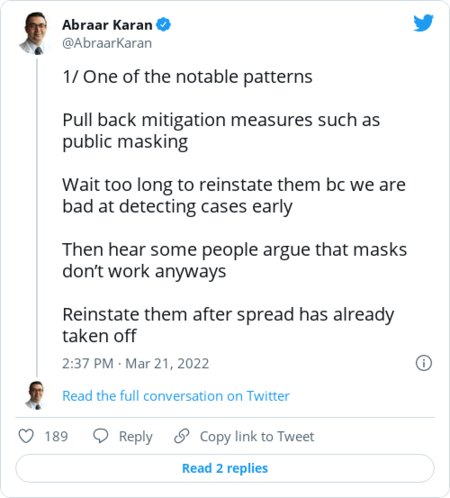 | | Jonathan Reiner — professor of medicine and surgery at George Washington University — on other early detection methods: | | | | | | Abraar Karan, physician and fellow at Stanford's division of infectious diseases and geographic medicine: | | | | | FDA advisory panel to weigh the future of boosters | | The FDA announced yesterday that it will convene a panel of independent advisers on April 6 to discuss considerations for future coronavirus booster doses. The meeting is aimed at helping the FDA create a general framework to decide, 1) what might warrant updating the composition of covid-19 vaccines to address specific variants, and 2) the timing and populations for who might receive a vaccine booster in the coming months. No vote is planned, and there won't be any discussion of product-specific applications. | - "Now is the time to discuss the need for future boosters as we aim to move forward safely, with COVID-19 becoming a virus like others such as influenza that we prepare for, protect against, and treat," Peter Marks, director of the FDA's Center for Biologics Evaluation and Research, said in a statement.