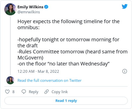 | | Emily Wilkins, Bloomberg Government: | | | | | | Here's the latest: Sen. Roy Blunt (Mo.), the top Republican on the Senate Appropriations health and labor subcommittee, told reporters there could be roughly $15 billion in the package for coronavirus aid, including $5 billion for the global pandemic response. | - A Senate aide also told The Health 202 that the figure could be around $15 billion.
