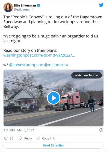 - The "People's Convoy," a group of hundreds of drivers protesting pandemic restrictions, is aiming to loop around the Capital Beltway once today and occupy two lanes of traffic while driving the minimum legal speed limit, The Post's Ellie Silverman and Karina Elwood report.