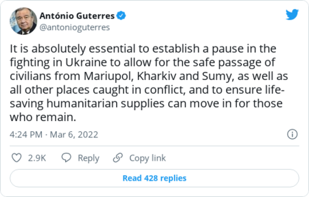 | | H202: What are some of those challenges you're facing in distributing aid? White said some of Doctors Without Borders's usual routes to deliver supplies are being disrupted or cut off due to fighting, and because air travel is restricted over Ukraine, her teams rely on troops to respect those traveling on the ground to offer humanitarian assistance. Habicht said WHO workers are experiencing similar challenges in dispersing aid and donated medical supplies. Habicht: "WHO had pre-positioned supplies in Ukraine, but some of these are now inaccessible due to military operations. … In Poland, we are setting up a logistics base to urgently get medical supplies and equipment into Ukraine. Equipment will arrive by plane [in Poland], including trauma kits and health kits, for onward transfer to Ukraine by land, for which a safe corridor is vital." | | António Guterres, secretary general of the United Nations: | | | | | | |  | From our reporters' notebooks | | | Getting to the 'next normal': Six former Biden covid advisers and nearly 50 other outside experts are jointly calling on the White House to ramp up efforts to fight long covid, improve indoor air quality, ensure workplace safety and pursue other measures they say are necessary to combat coronavirus and the risk of other infectious diseases. The group's plan, posted this morning at covidroadmap.org, calls for broadening the fight against covid-19 to include all respiratory viruses, our colleague Dan Diamond writes to us. The experts also say that the virus is not yet "endemic," and that it's too soon to let down the nation's guard. | - "We're not there yet," Ezekiel Emanuel, a University of Pennsylvania bioethicist who coordinated the effort, said in an interview with Dan. He also warned that a White House proposal for $22.5 billion in new funding for the domestic and global coronavirus response fell far short of the actual need.