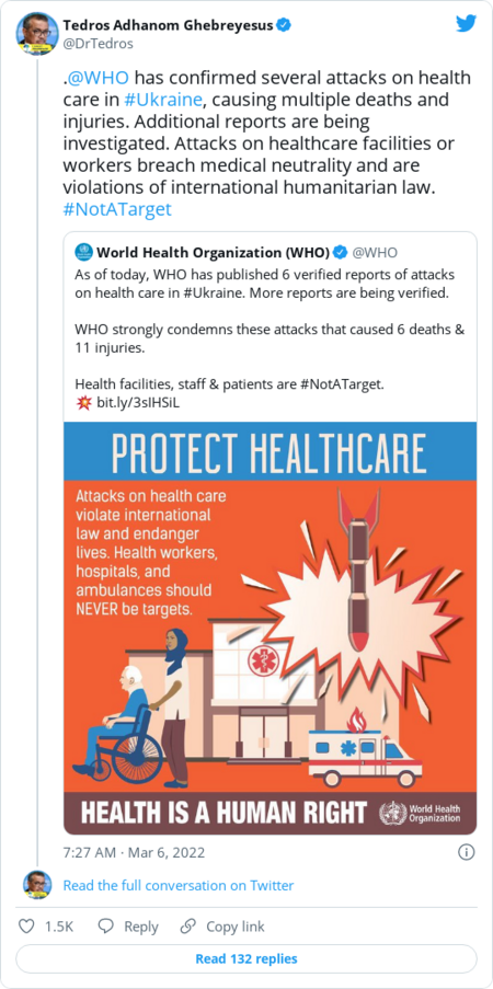 | | Key context: On Sunday, WHO director general Tedros Adhanom Ghebreyesus confirmed that there have been several attacks on health-care facilities in Ukraine resulting in multiple deaths in violation of international humanitarian law. | - The WHO has recorded six deaths and 12 injuries, of which seven are health workers, as a result of several attacks on medical buildings since Russian forces began invading Ukraine. Some health-care facilities were assaulted using heavy weapons, which include tanks, missiles or bombs.