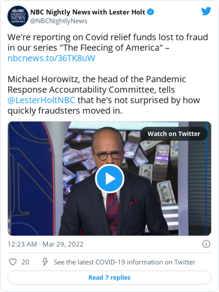 | | "NBC Nightly News" aired the first episode last night of their investigative series into how the U.S. government's spending during the pandemic led to the "biggest fraud in a generation." What they found: | - Individuals and organized crime groups used stolen identities to claim jobless benefits from state workforce agencies disbursing federal funds, which could be worth up to $30,000 in benefits per identity.