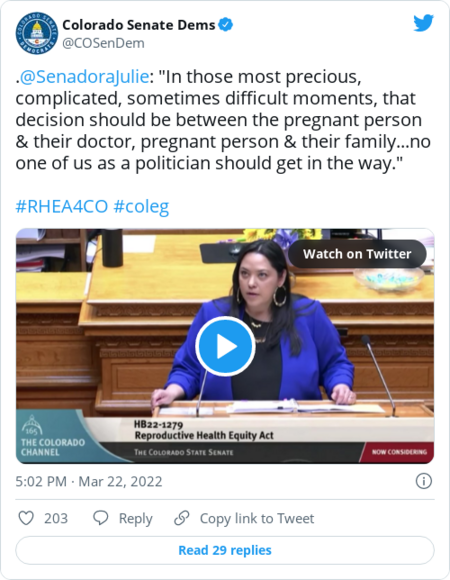 | | Colorado state Sen. Julie Gonzales (D), debating the Reproductive Health Equity Act on the Senate floor: | | | | | | |  | In other health news | | - On the move: Kirsten Allen will leave her role as national press secretary for coronavirus response at HHS to serve as Vice President Harris's new press secretary, CNN reports.