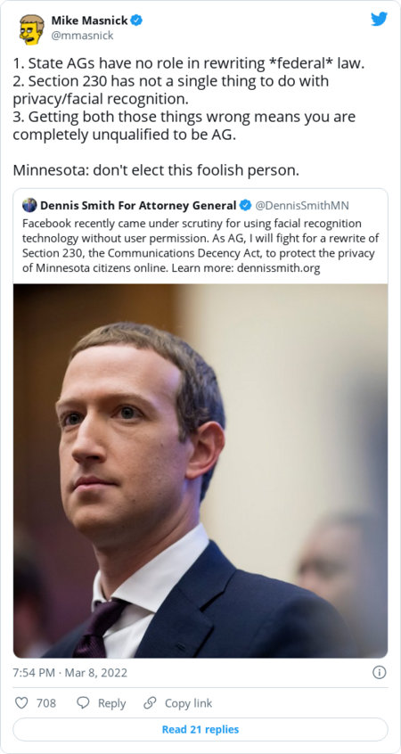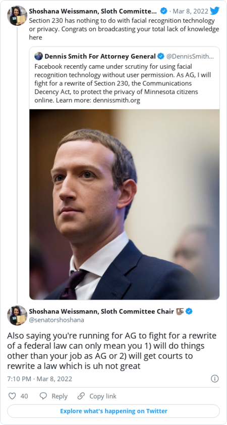 | | |  | Rant and rave | | | Former Minnesota state representative Dennis Smith, a Republican who is running to be the state's attorney general, posted a tweet about Section 230 that was not well received: | | The R Street Institute's Shoshana Weissmann: | | |  | Agency scanner | | | |  | Hill happenings | | | |  | Inside the industry | | | By Chris Velazco, Heather Kelly and Tatum Hunter ● Read more » | | | | | |  | Trending | | | |  | Mentions | | - Evan Swarztrauber, a former aide to FCC Commissioner Brendan Carr and former FCC Chairman Ajit Pai, has joined the Lincoln Network as a senior adviser for tech and telecom policy.