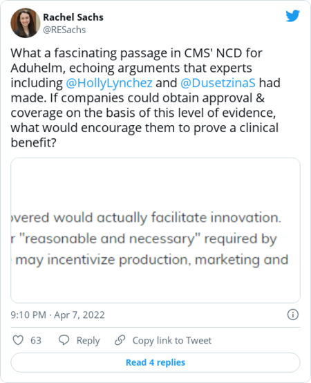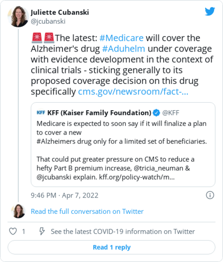 | | The decision is a fascinating case study of the interplay between two key federal agencies. The Food and Drug Administration approved the treatment last summer despite clear evidence it works. And CMS essentially limited its use. | | Kaiser Family Foundation's Juliette Cubanski | | | | | | Medicare was staring down a critical question: Is the drug "reasonable and necessary" for treating the disease? That answer determines whether the federal insurance program pays for the expensive drug. | | To make its final decision … CMS reviewed roughly 250 documents and received a record 10,000 comments on its proposed coverage decision, vastly more than the 131 comments it netted during a public input period ahead of the proposal last summer. The agency's conclusion: "There's not currently enough evidence of clinical benefit to say that [Aduhelm] is reasonable and necessary for people with Medicare," Lee A. Fleisher, CMS's chief medical officer, told reporters yesterday. CMS largely hued closely to the proposal it released back in January — but with some slight modifications. | - The agency is limiting payments for the drug to those in carefully controlled tests of the medication's effectiveness. But those clinical trials could be approved by the FDA or the National Institutes of Health, and don't have to be sanctioned by CMS as originally proposed.