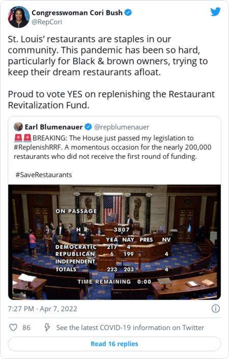 | | The House package faces an uncertain fate in the Senate, where a similar bipartisan bill was recently introduced that includes billions for gyms, minor league sports teams, and transportation companies, among other businesses, that were affected by the pandemic, in addition to $40 billion for the Restaurant Revitalization Fund. | | Rep. Cori Bush (D-Mo.): | | | | | U.S. life expectancy declined again during the pandemic's second year | | Life expectancy in the United States continued to slide downward in 2021, a new study by public health experts found, after it dramatically declined in 2020 as the coronavirus swept through the country, The Post's Joel Achenbach and Dan Keating report. Across all groups, life expectancy dropped to 76.60 years last year — down from 76.99 in 2020 and 78.86 in 2019 — despite the arrival of coronavirus vaccines. Researchers found the continued decline in life expectancy last year was largely among White Americans. | | |  | In other health news | | - A U.S. appeals court reinstated Biden's vaccine mandate for federal executive branch employees, CNN reports.