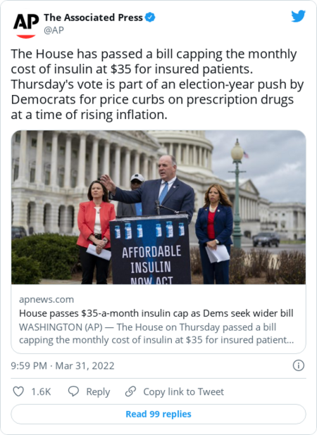 | | The Associated Press: | | | | | | The politics are pretty clear here. Now let's walk through the effort's prospects. | | In the House … the chamber passed the bill curbing how much patients with Medicare or private insurance spend on insulin per month in a 232-to-193 vote, with a dozen Republicans supporting the measure. | - The GOP argument: "By just price setting, I'm concerned about what this does for diabetes research going forward," Rep. Brett Guthrie (Ky.), the top Republican on the House Energy and Commerce health subcommittee, told The Health 202.