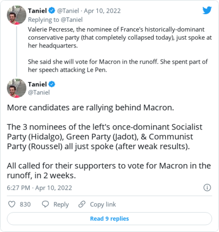 French President Emmanuel Macron attends a campaign rally at Paris La Defense Arena in Nanterre, France, on April 2. (Sarah Meyssonnier/Reuters) | Charles de Gaulle, the towering French leader who ushered in the country's Fifth Republic, believed in a strong presidency anchoring a strong, stable state. The constitution that he and his allies implemented provided for direct universal suffrage elections for the presidency, organized over two rounds. By doing so, executive power in France could be insulated from the vagaries of parliamentary and party politics. The second round runoff, moreover, would likely help protect the republic from extremist challengers, who in theory could never command a majority of votes in a two-person contest. That logic may still hold more than six decades later as French voters await the April 24 second round runoff between President Emmanuel Macron and far-right candidate Marine Le Pen. But it may not. Le Pen — who finished, as expected, second in first-round round voting Sunday, three points behind Macron — will likely not in two weeks face the same landslide defeat that Macron scored over her five years ago. Macron had emerged then as a young maverick centrist who campaigned on a platform of "neither left nor right." In 2017, a big-tent coalition of voters across the political spectrum united to give him a resounding runoff victory over Le Pen, the scion of a movement once rooted in neofascism and anti-democratic violence. Polls now suggest a far tighter contest, with many on the French right and potentially even some voters from the far-left casting a ballot for Le Pen. Abstentions from a growing pool of people disenchanted with their options and tired of Macron may also boost Le Pen's chances. Macron, far from an outsider reinvigorating the French state, appears to many of his opponents as the aloof agent of a wealthy elite establishment and custodian of a fragile status quo in need of reform. Le Pen worked hard to detoxify her and her party's image, casting herself as an empathetic economic populist. She was also somewhat aided by a rival far-right bid from ultranationalist gadfly Eric Zemmour, whose incendiary rhetoric served to make her look all the more moderate. "Le Pen largely avoided emphasizing her most controversial proposals and instead focused on echoing popular concerns about the economy and rising inflation," explained my colleague Rick Noack. "But in their substance, many of Le Pen's positions are as radical as they were five years ago. This past week, she vowed to issue fines to Muslims who wear headscarves in public." "For many French people, the Le Pen name is no longer viewed with disdain," wrote the Guardian's Kim Willsher, on the trail with the far-right candidate. Now, she added, "Macron will face the biggest political fight of his career to keep her out of the Élysée Palace." Le Pen's seeming rehabilitation is also thanks to Macron's own political trajectory. While the country's traditional mainstream factions — the center-left Socialists and center-right Republicans (standard bearers of de Gaulle's political legacy) — remain relevant in local and municipal votes, they have been humbled on the national stage, losing most of their voters to Macron and his movement. In the presidential vote, they were wiped out, pooling less than 7 percent of the vote, collectively. "A complete reconfiguration of French politics is about to take place," said Tara Varma, senior policy fellow at the European Council on Foreign Relations, in an email. "It started in 2017 but will now be achieved." Meanwhile, more than half the French electorate opted for candidates on the anti-establishment extremes, including Le Pen, Zemmour and far-left firebrand Jean-Luc Mélenchon, who finished just short of Le Pen. "What is happening is that the moderate left and right are disappearing," said Pierre Mathiot, the director of Sciences Po Lille, to my colleagues. "Macron is in the process of crushing the center of politics — but the more he crushes it, the more he gives room to the radical wings." Other analysts argue that Macron is, himself, a center-right politician. He "has systematically adopted [the mainstream right's] core positions, including retirement at 65, work requirements for welfare beneficiaries, and a reduction in the inheritance tax. This amounts to a full-scale takeover of the French center right," wrote Daniel Cohen, president of the Board of Directors of the Paris School of Economics. "If Macron is re-elected, he will preside over a formidable big-tent party, and the Republicans will be left with crumbs, squeezed between a resurgent far right and a governing party that is intent on devouring them." Part of what's in play follows trends familiar elsewhere in Western European politics — specifically, the weakening of traditional mainstream parties in favor of a more complicated, fragmented political scene. But in France, unlike Germany, environmental politics championed by the center left took a back seat to culture warring over immigration and national identity. By the end of his term, Macron had pivoted sharply right, unfurling legislation against "Islamist separatism" in French society, while his allies inveighed against "Islamo-leftism" in universities. | | | The cultural anxieties coursing through the election campaign won't be easy to reconcile. "I want to be optimistic," Shahin Vallée, a former Macron adviser now at the German Council on Foreign Relations, told the New Statesman. "But it is a long-run optimism — that we can get over these tensions and accept this multi-faith and multi-cultural society, which means accepting a different definition of universalism from the one we have now." For the time being, though, the French left appears demotivated and divided, while the French president may continue fighting Le Pen on her terrain. "Macron is playing a dangerous game," wrote Didier Fassin, director of studies at the École de